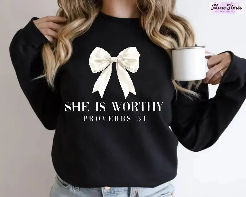 Comfort Colors Christian Women's Sweatshirt, She Is Worthy Bow Shirt, Girly Faith Based  Religious Gift, Bible Verse Women's Sweatshirt Casual Print Long Sleeve Round Neck Pullover for Daily Wear, Ladies Clothing Fall & Winter Fashion Unisex Sweatshirts
