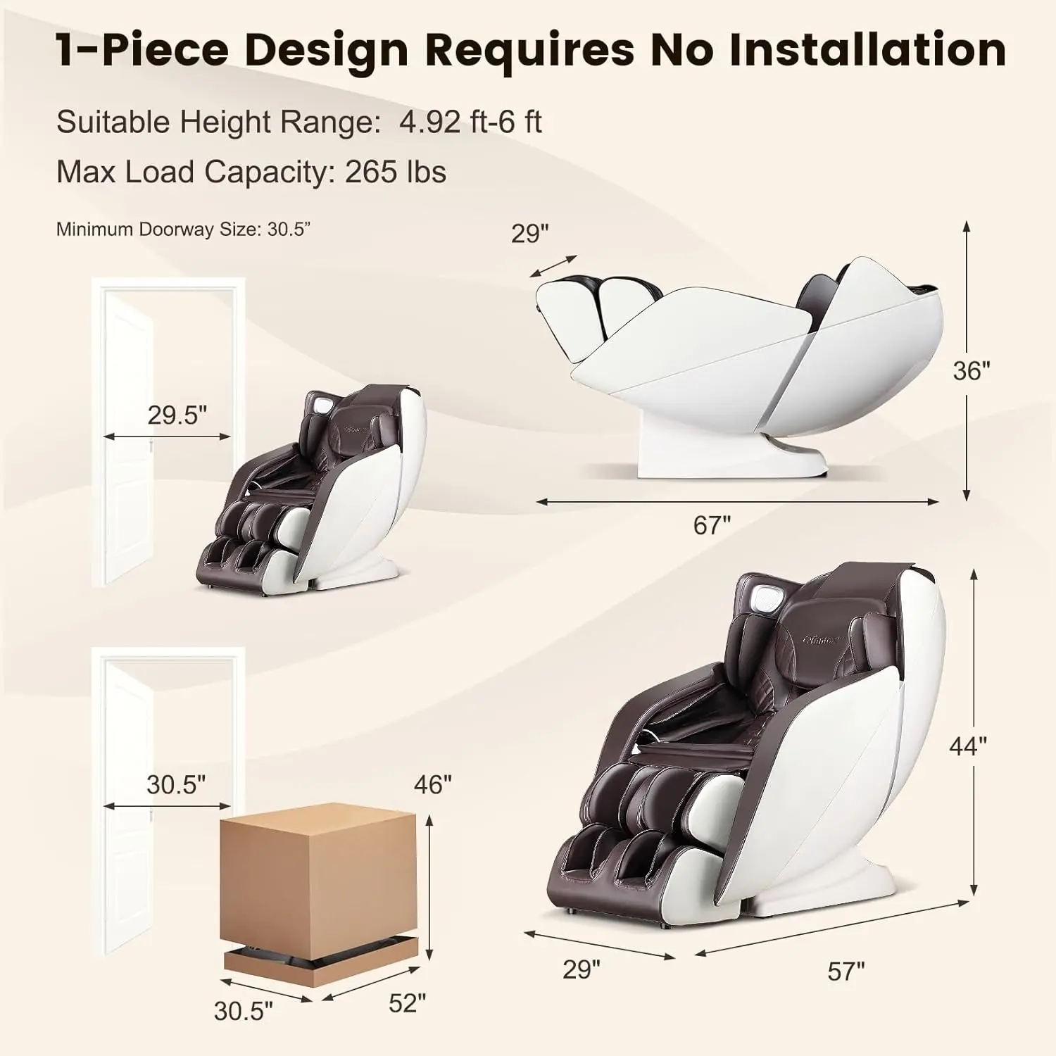 • 3 Level Zero Gravity and Timer Design: Under zero gravity mode, your heart will be lower than legs to reduce pressure on the spine, making your body fully relaxed. The 6.5” retractable calf frame can accommodate people of different heights from 4.92 ft to 6 ft. The Max load capacity is 265 lbs. Plus, the massage chair has a timer to shut off automatically after 5-30 minutes.