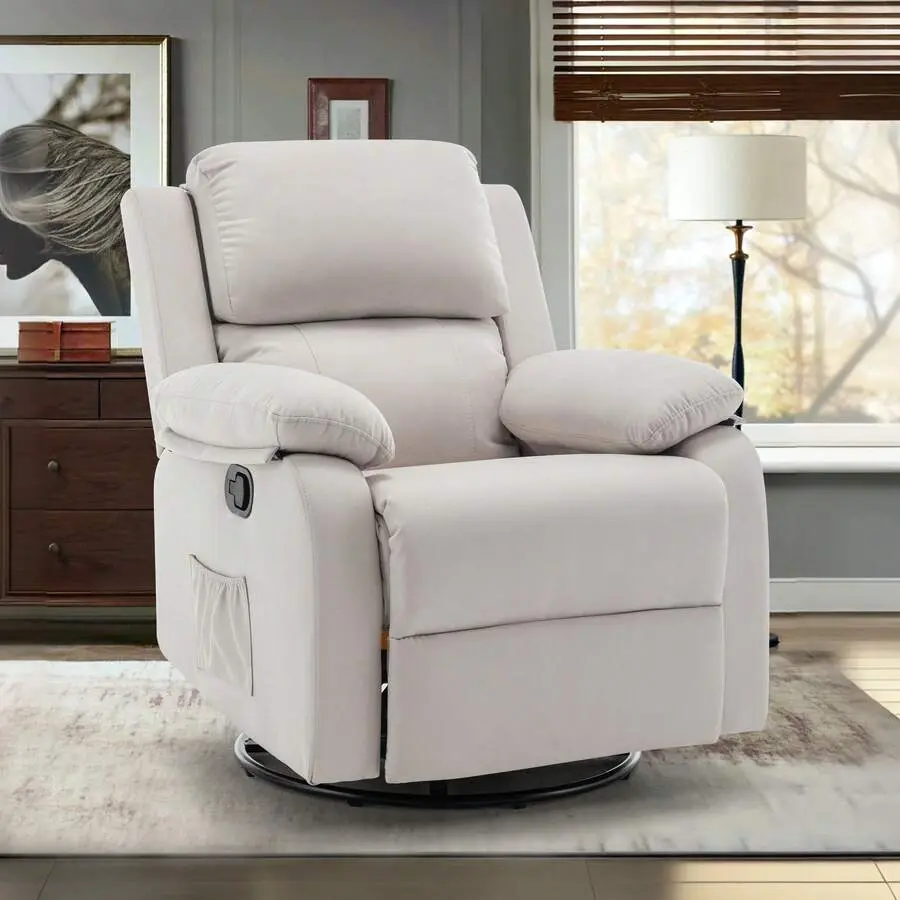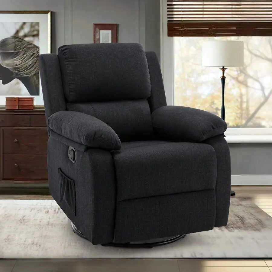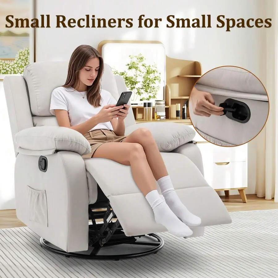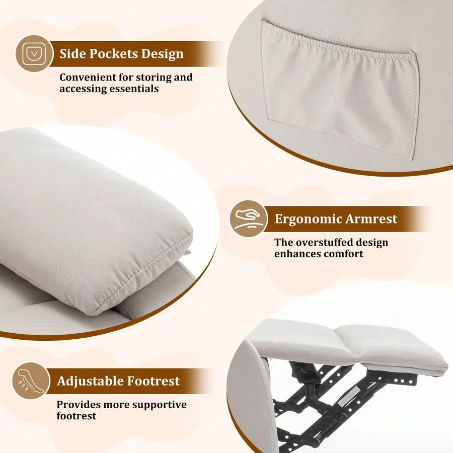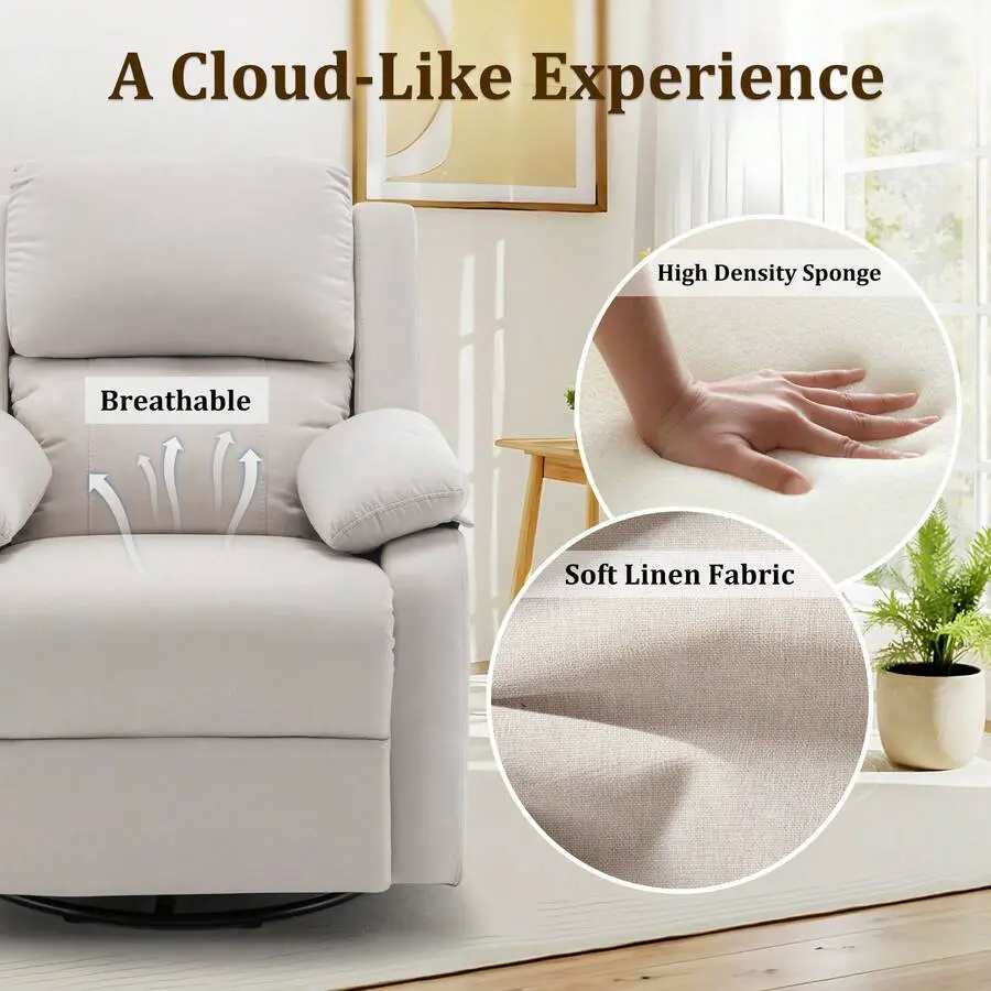 Swivel Rocker Recliner Chair is thoughtfully designed to bring effortless comfort to compact living spaces. Whether you're relaxing after a long day or enjoying a quiet afternoon, this chair is the perfect place to unwind. This recliner supports 360 ° smooth swivel and gentle 30 ° rocking motions, allowing you to shift positions freely-ideal for reading, watching TV, or simply taking a nap. With adjustable angles from 105 ° to 165 ° , it adapts to your body's needs in every moment. This recliner chair features a user-friendly side handle for easy reclining. Just one pull and you're leaning back into relaxation. The overstuffed backrest and seat cushioning offer a plush, supportive feel from every angle. Swivel Rocker Recliner Chair includes well-placed side pockets for easy storage of remotes, books, or phones-keeping your essentials always within reach. Swivel Rocker Recliner Chair is built with an adjustable footrest and ergonomic armrests that enhance both posture and comfort. The sturdy frame and breathable linen upholstery make it a durable yet cozy choice for everyday use. Whether you're short on space or big on comfort, this recliner chair brings relaxation to every corner of your home.