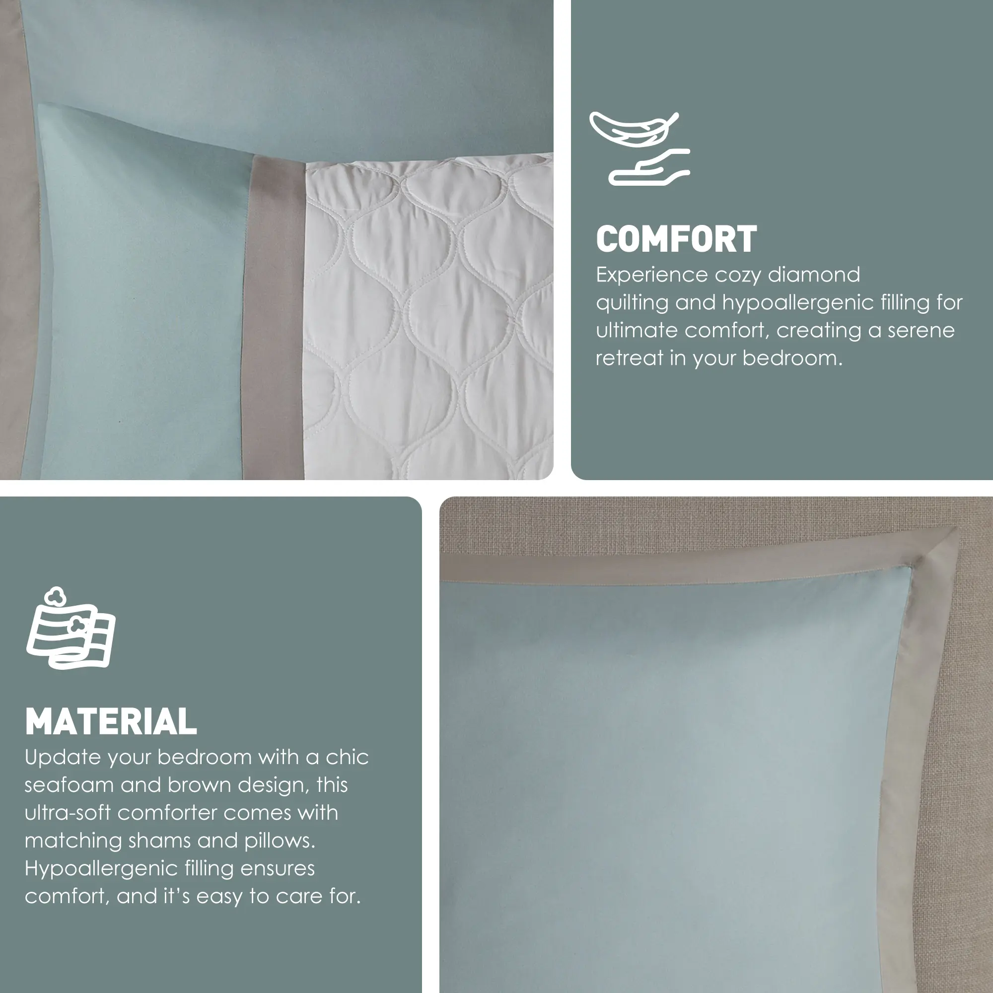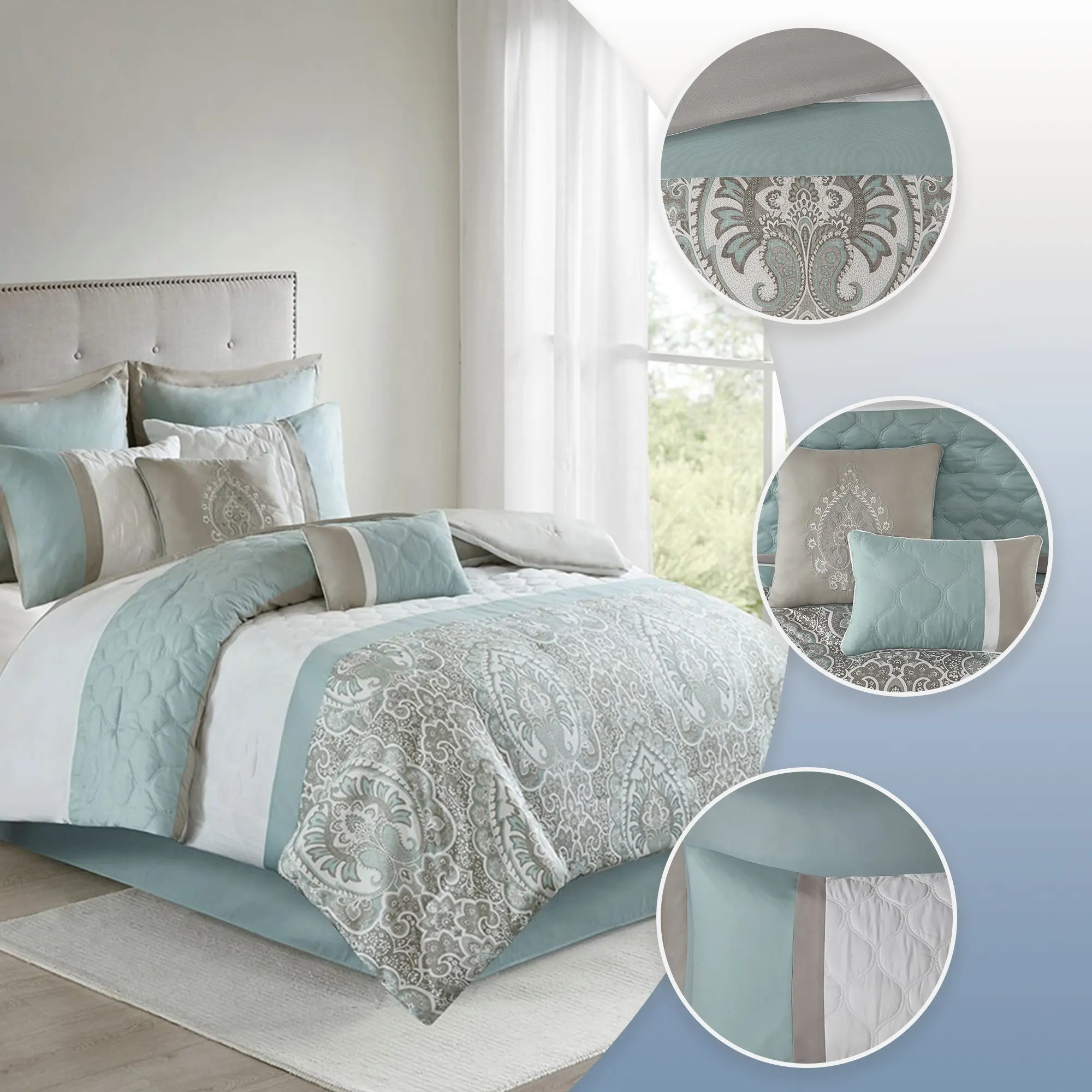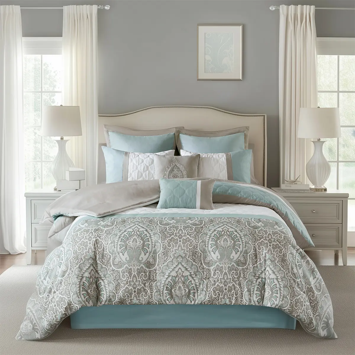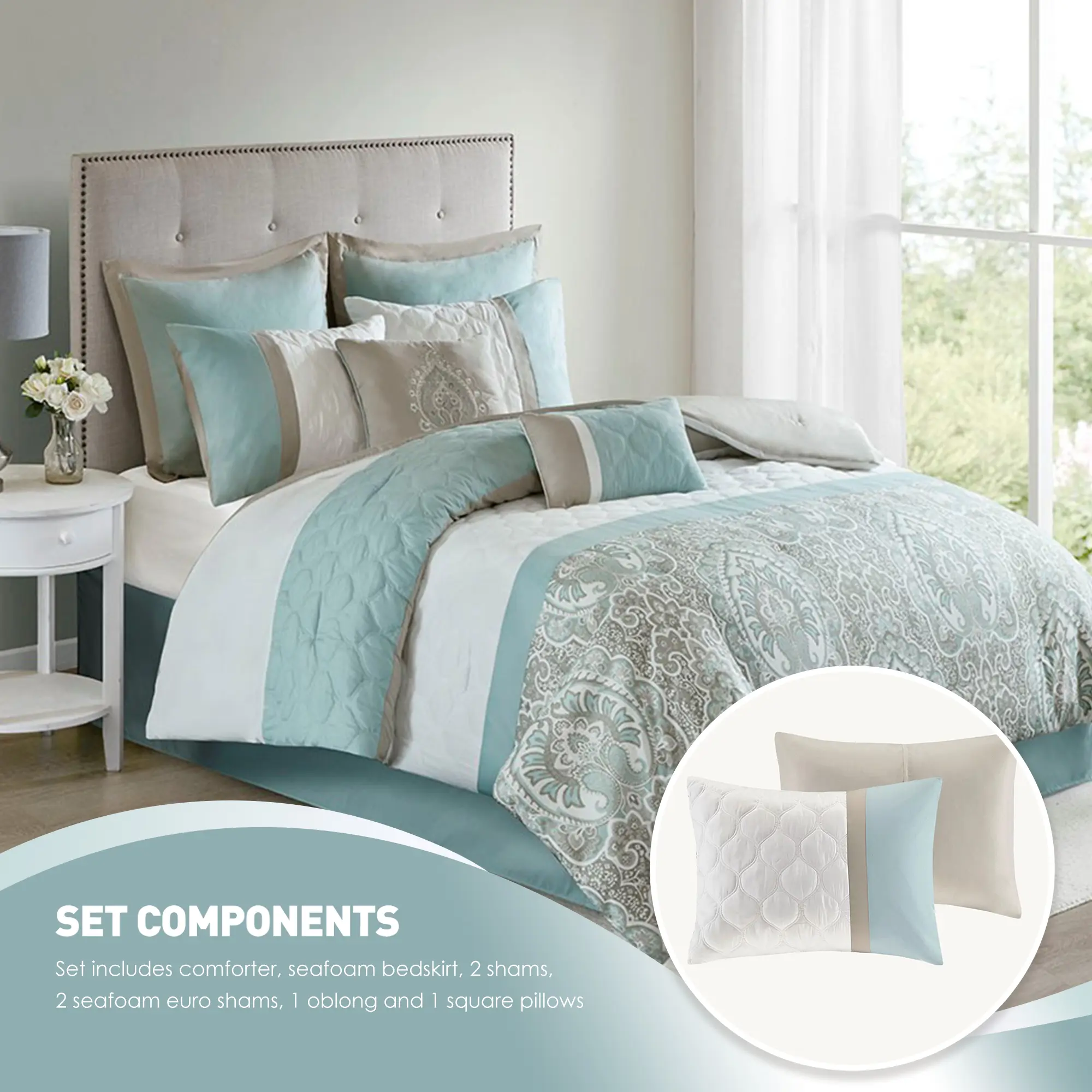 • Set includes comforter, seafoam bedskirt, 2 shams, 2 seafoam euro shams, 1 oblong and 1 square pillows
