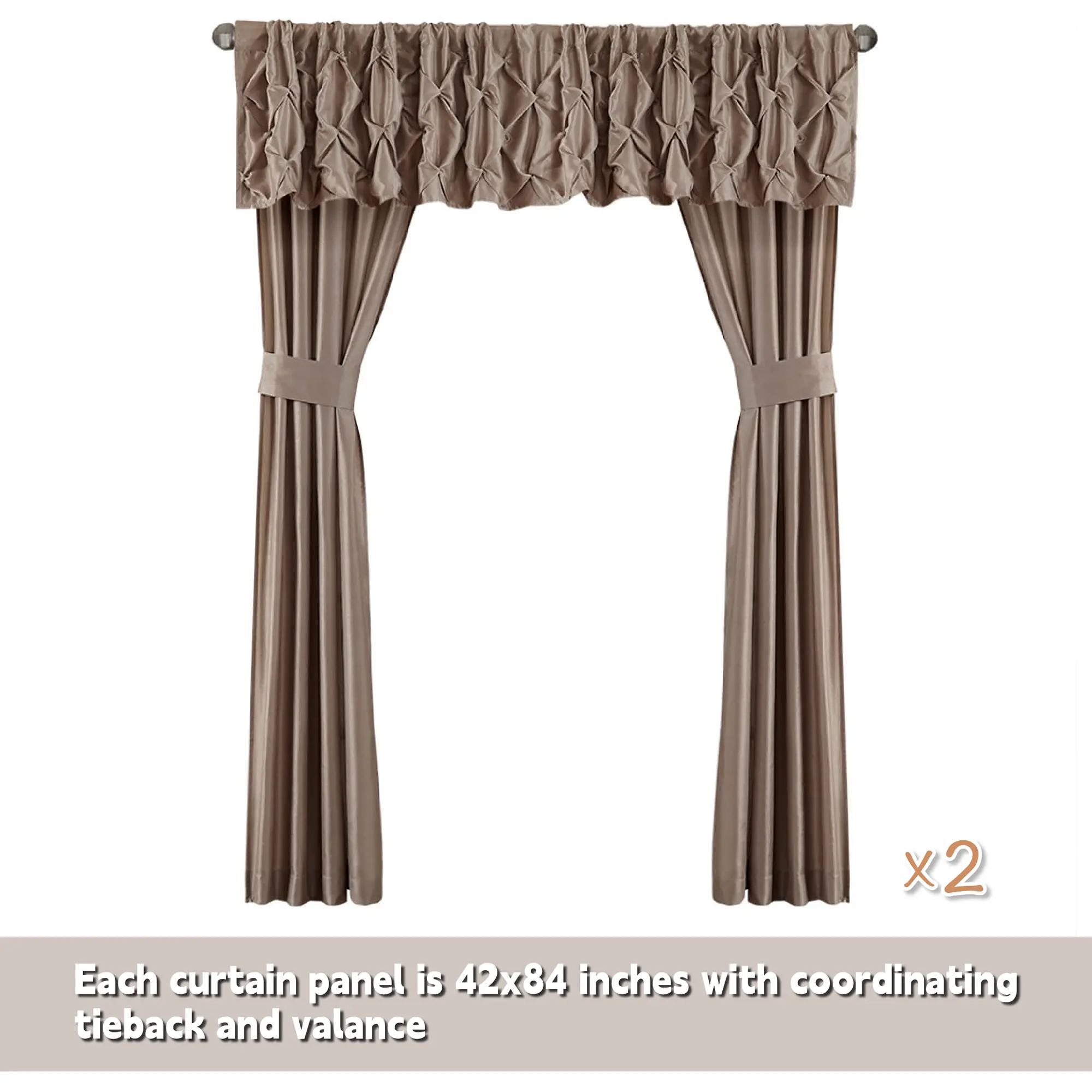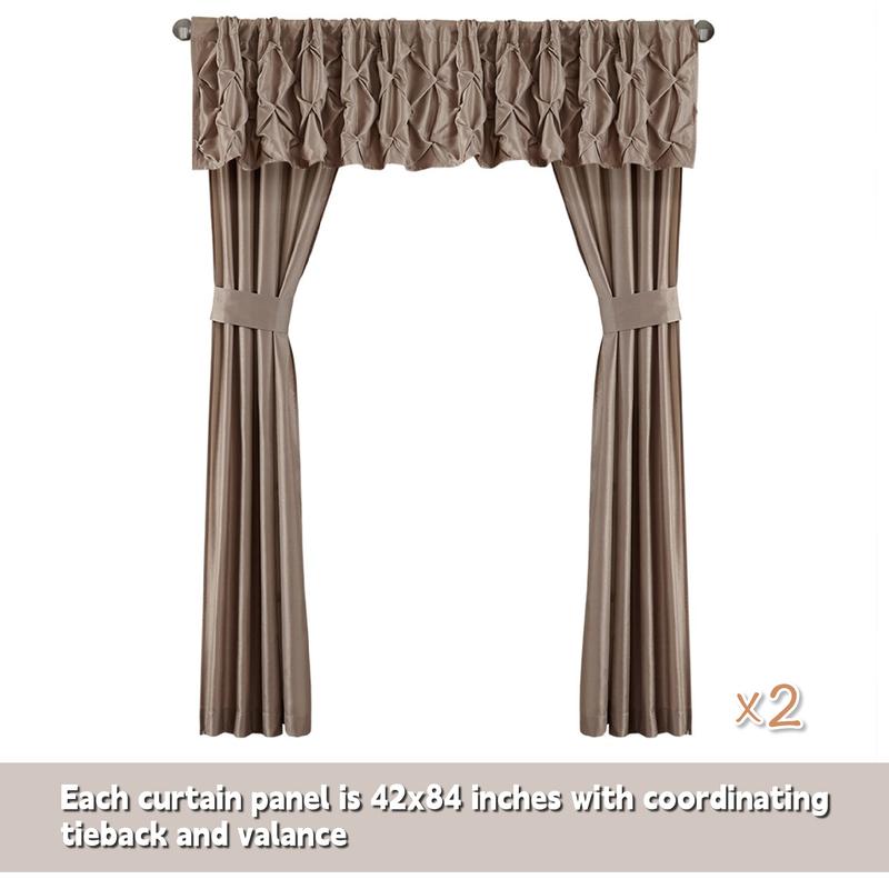 • Each curtain panel is 42x84 inches with coordinating tieback and valance
