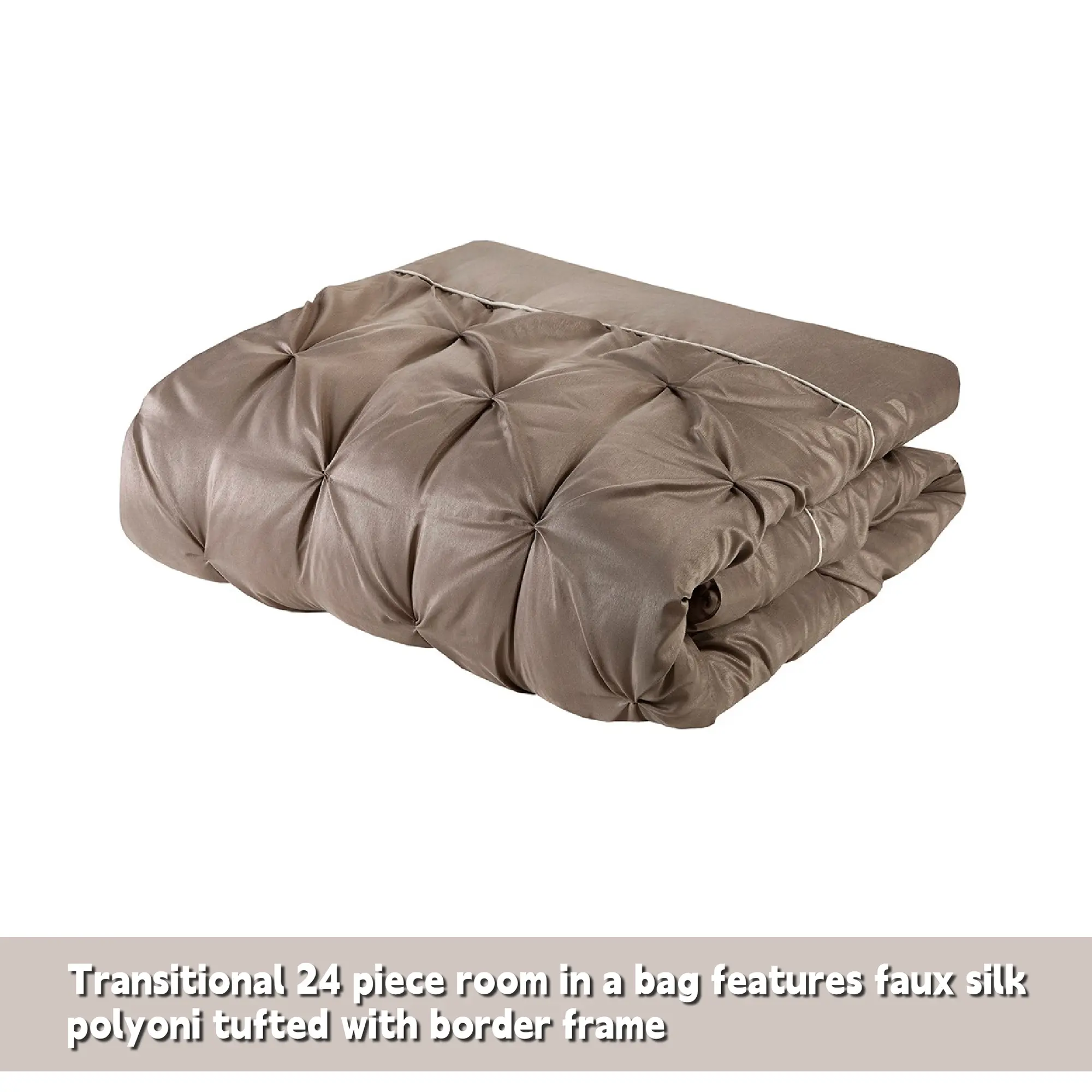 • Transitional 24 piece room in a bag features faux silk polyoni tufted with border frame