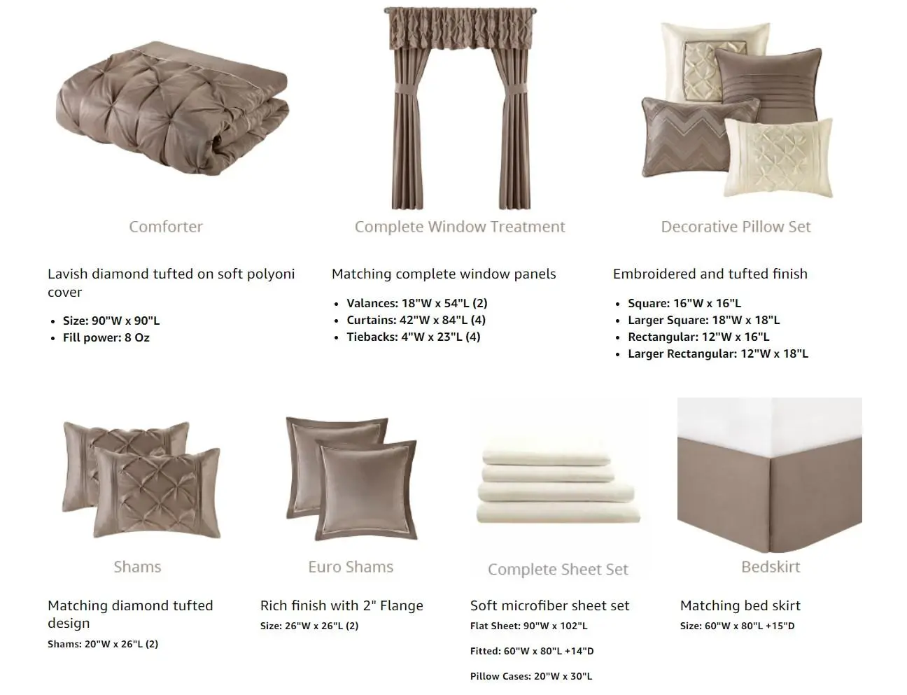 • Set includes comforter, bedskirt, 2 shams, 2 square and 2 oblong decorative pillows, 2 euro shams, 4 piece sheet set, 4 window curtains, 4 tiebacks, 2 valances