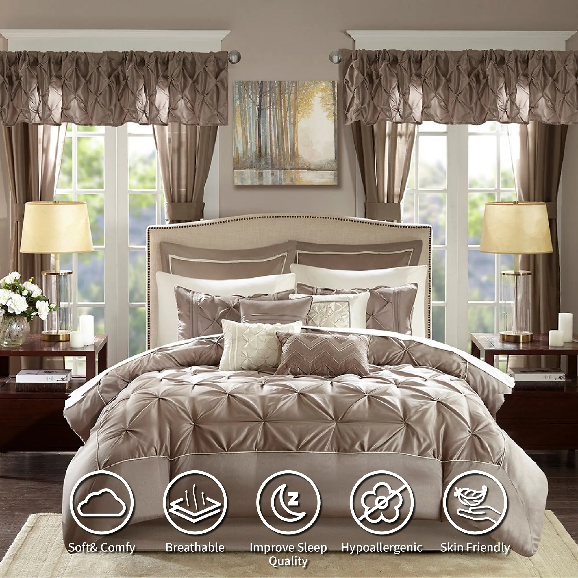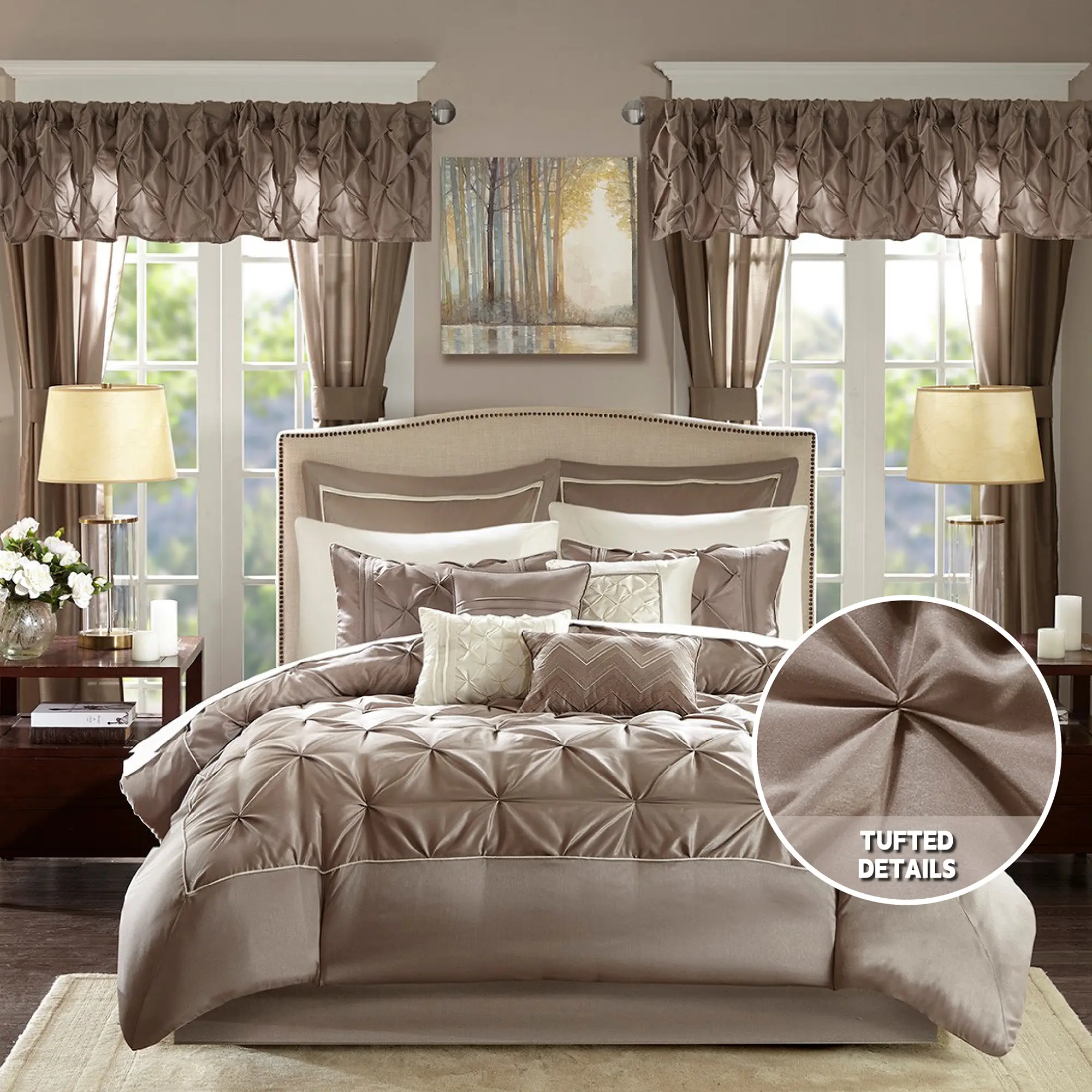 Invigorate your space with the Madison Park Essentials Joella 24 Piece Room in a Bag. The lavish tufted details flaunted on the comforter, shams, and window valances deliver an elegant statement in bold, natural hues. A large border frames the luxurious comforter, adding charm and dimension to the bedding set. Matching shams echo the motif seen on top of the bed, creating an elegant look in your space. An included microfiber sheet set and bed skirt complements the bedding collection and offers exceptional comfort and style. Two Euro shams and four embroidered decorative pillows help to complete the bedding set, giving it a finished look. Accompanying this bedroom set are four window panels with four tie backs to keep curtains drawn open, while two tufted valances provide the finishing touches to your bedroom. This bedding set may come in rolled or compressed packing and will need to be fluffed up. Use a steam iron to help remove wrinkles easier.