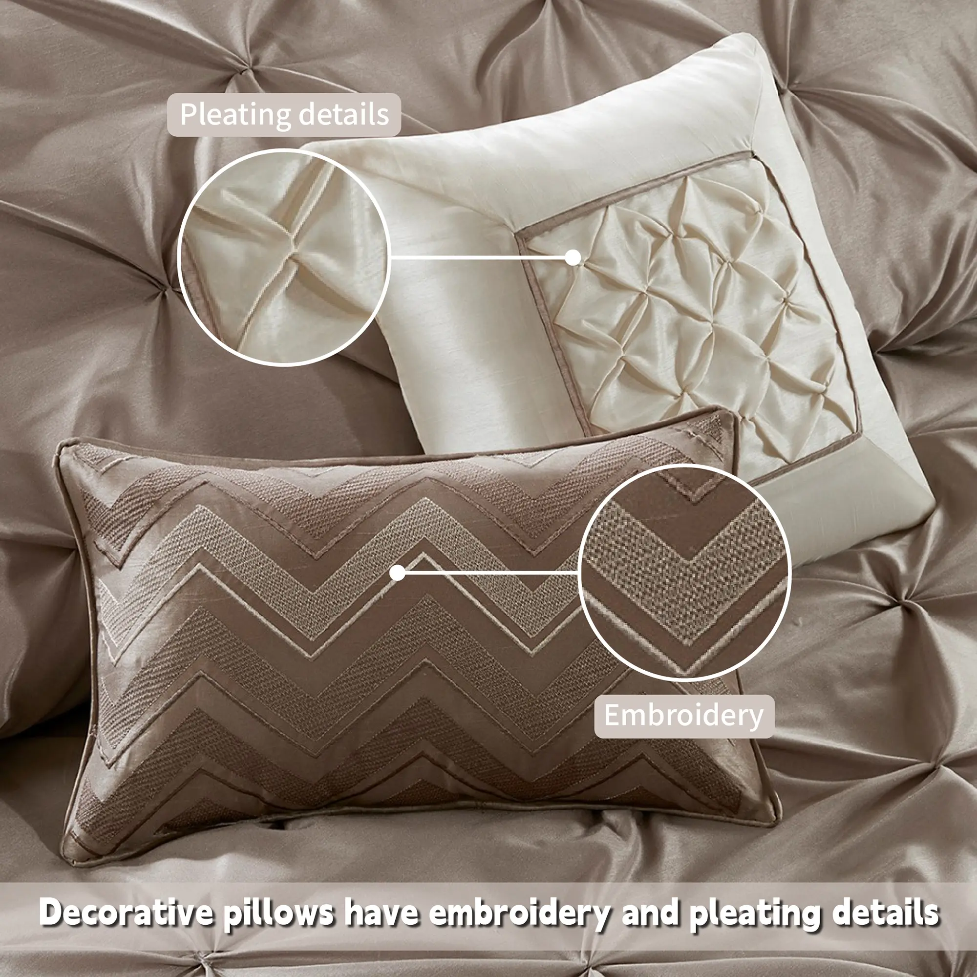 • Decorative pillows have embroidery and pleating details