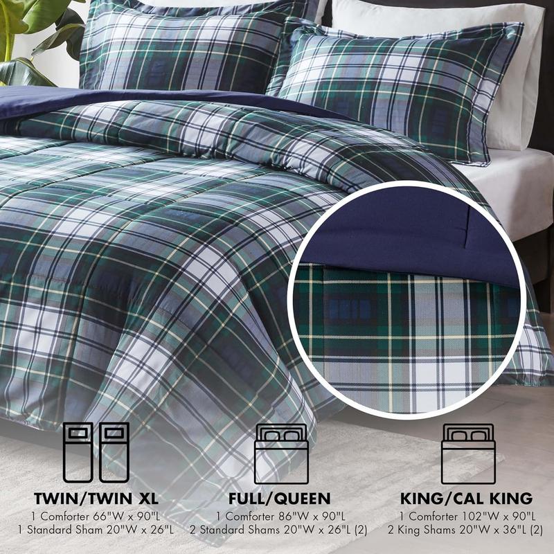 Sleep comfortably with the Madison Park Essentials Parkston 3M Scotchgard Down Alternative Comforter Mini Set. Sporting a cool plaid pattern, this ultra-soft comforter brings a classic casual style to your bedroom decor. The matching shams (1 in Twin/TwinXL) feature 2-inch flanges that add a charming touch to the top of the bed. A 3M Scotchgard Moisture Management Treatment helps wick away moisture to keep you cooler and drier for a comfortable nightโs sleep. This comforter set is OEKO-TEX certified with an antimicrobial treatment, meaning it does not contain any harmful substances or chemicals and reduces the risk of bacterial growth to ensure quality comfort and wellness. Items in the set may come in a rolled or compressed packaging, which will need to be fluffed up or steam ironed before use to remove wrinkles.