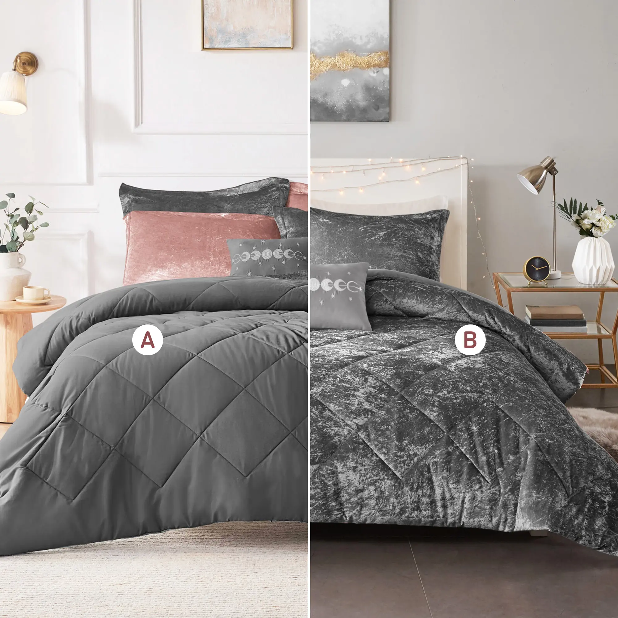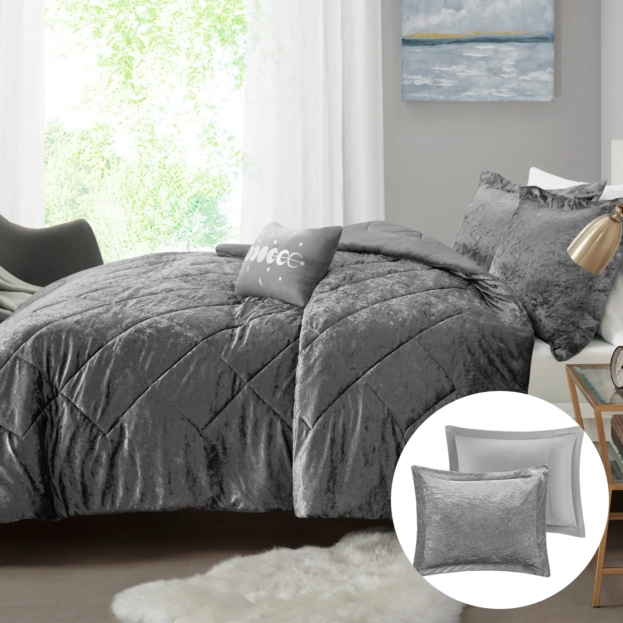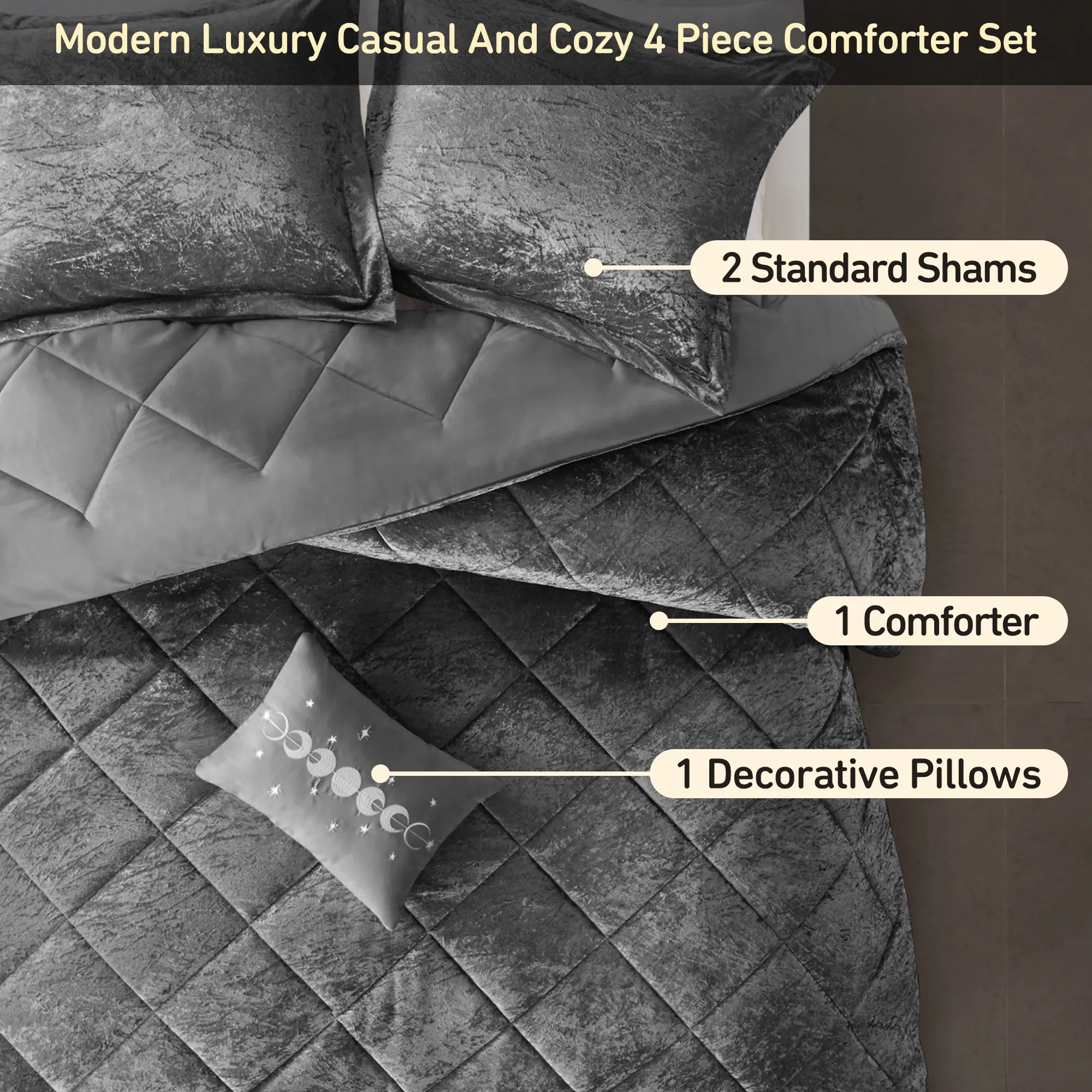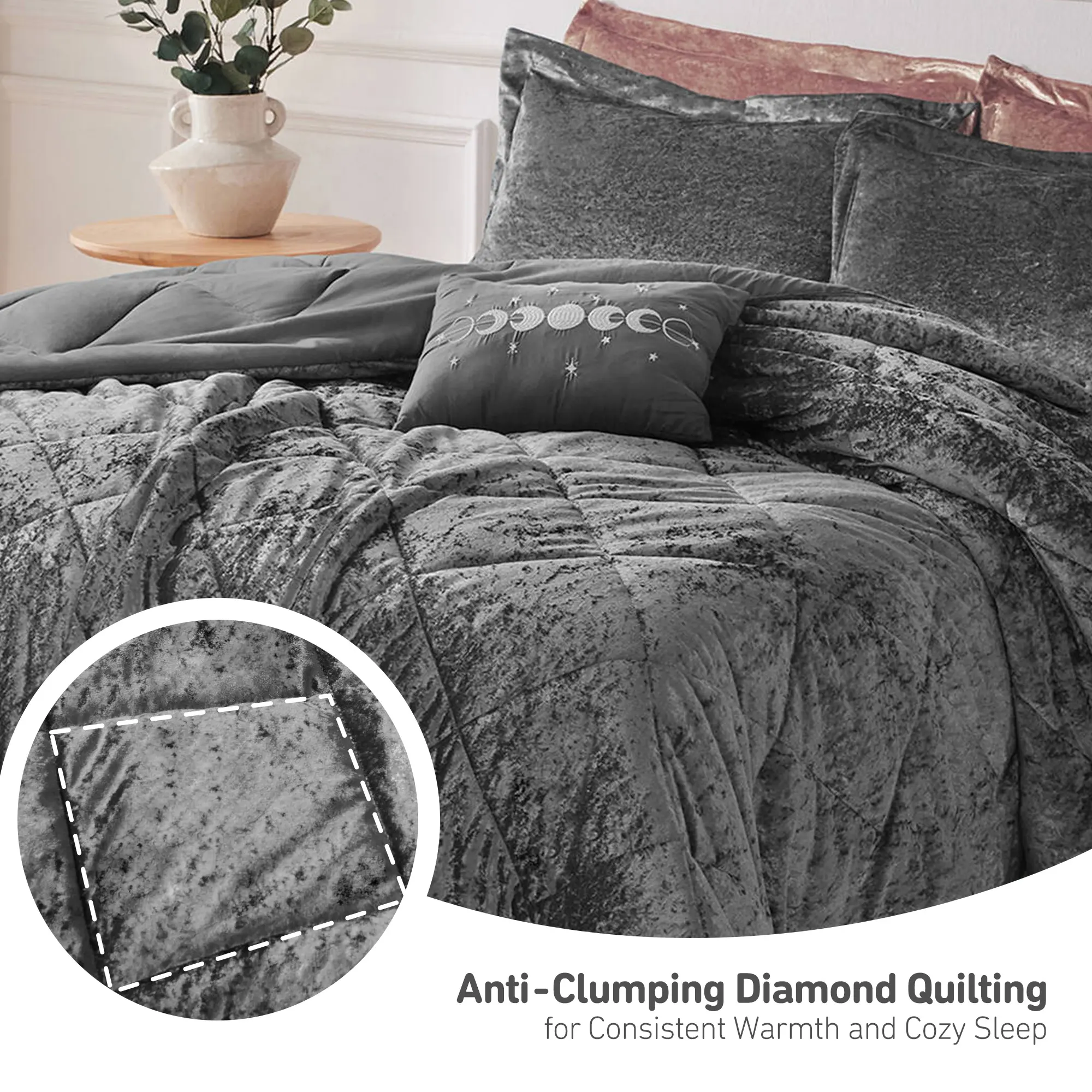 • Luxurious crushed velvet comforter set features diamond quilting on top of the bed