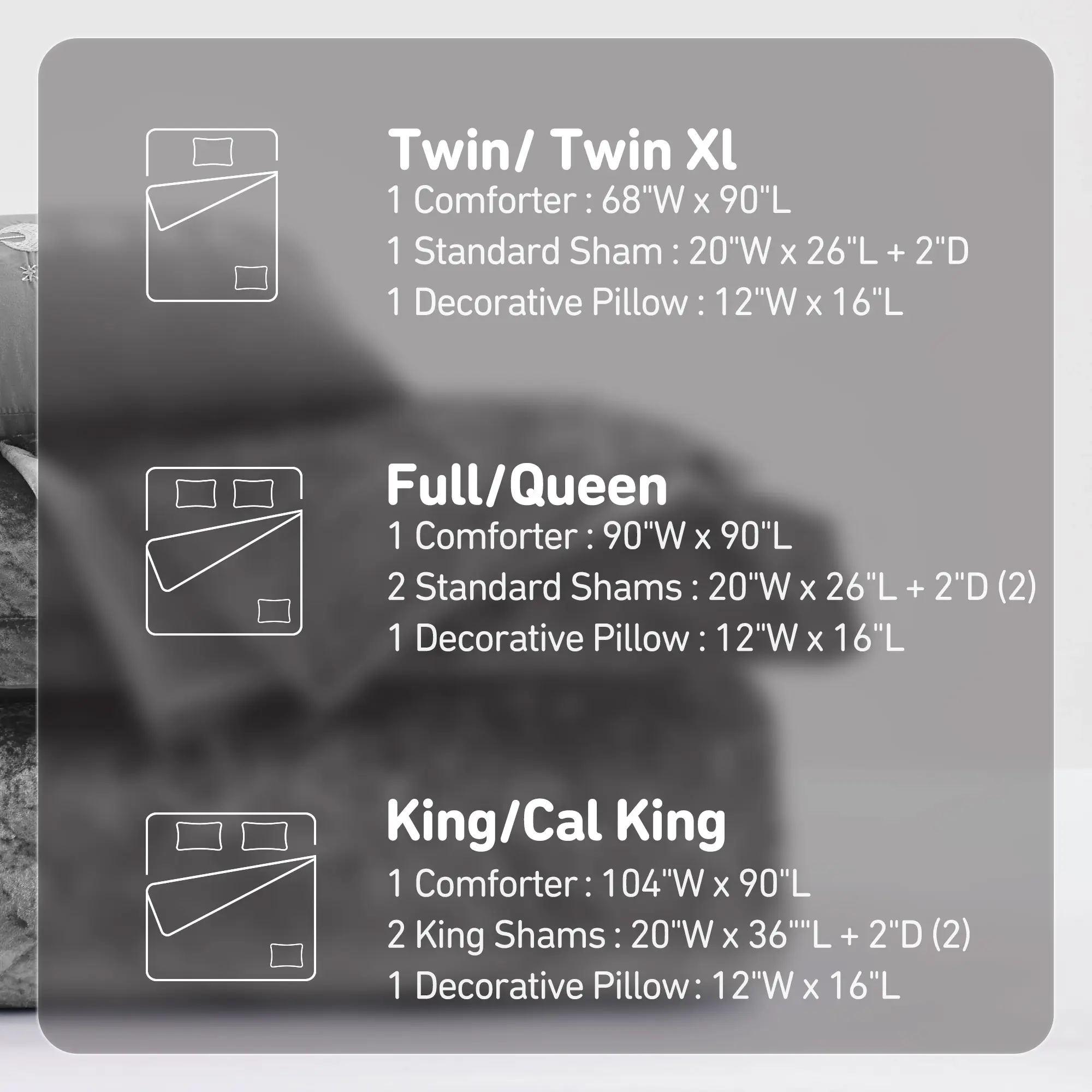 1 Comforter:90"W x 90"L