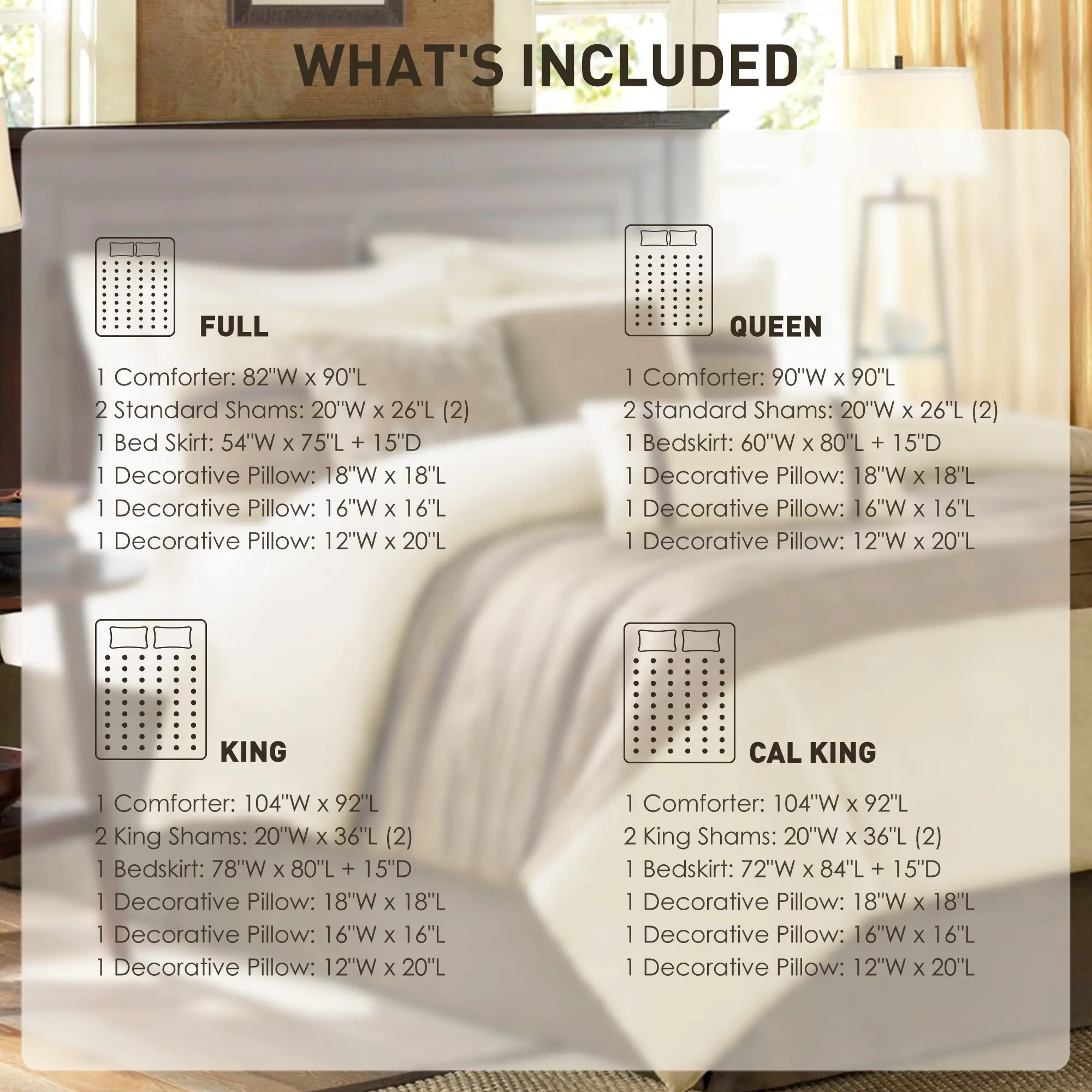 β’ Set includes 1 comforter, 2 matching shams, 3 decorative pillows and 1 bed skirt