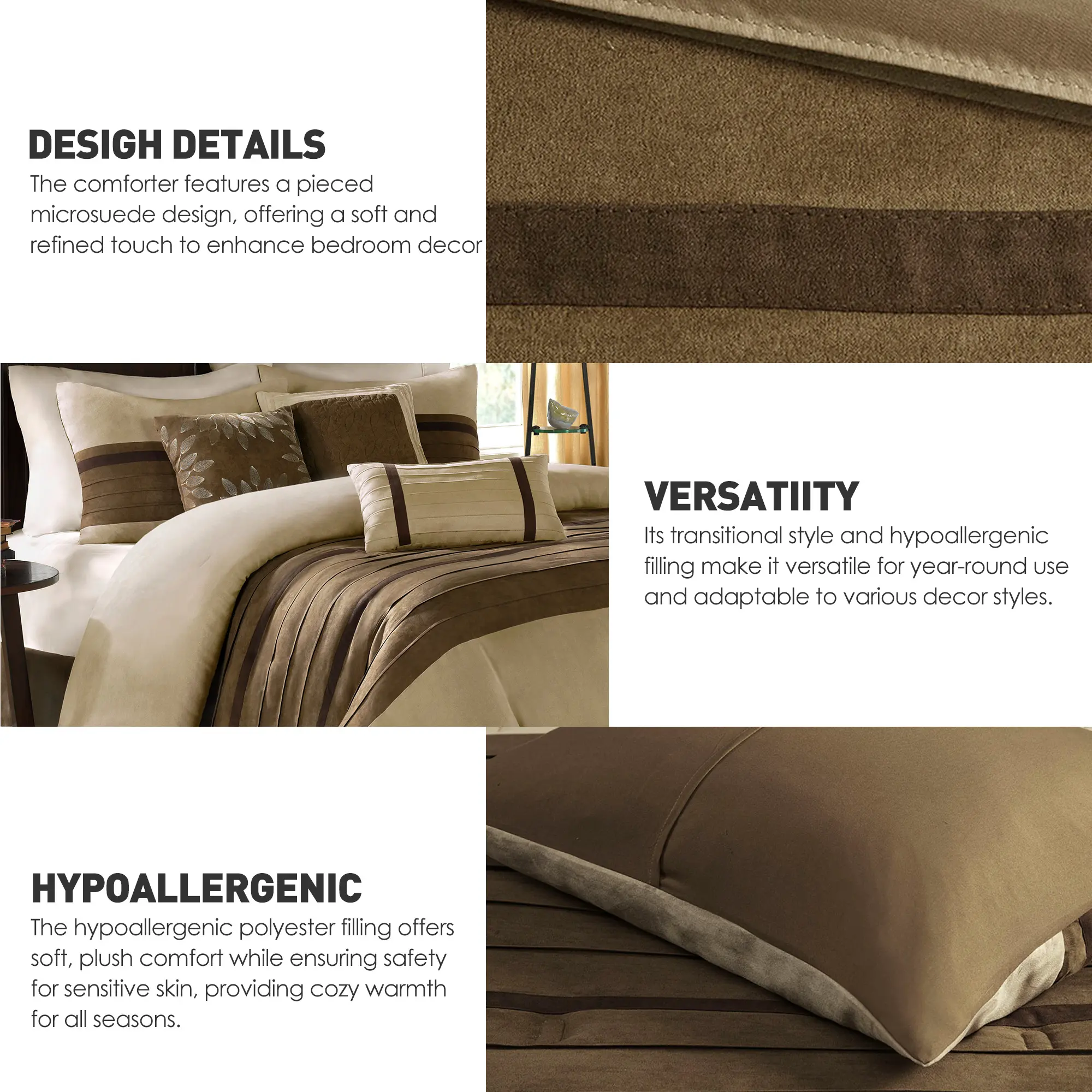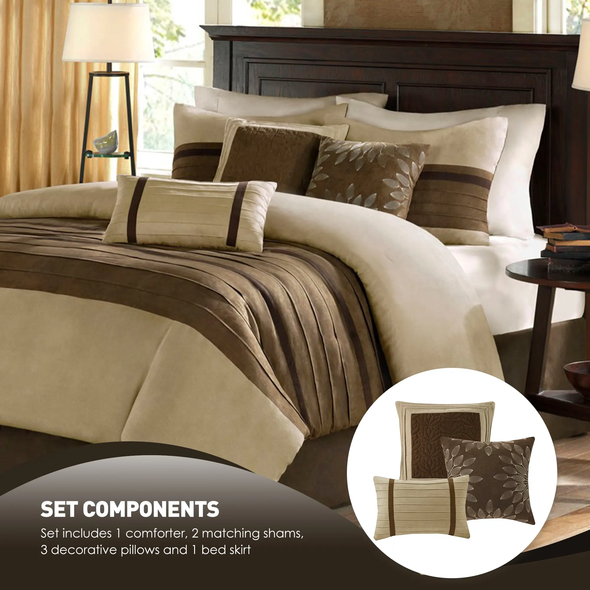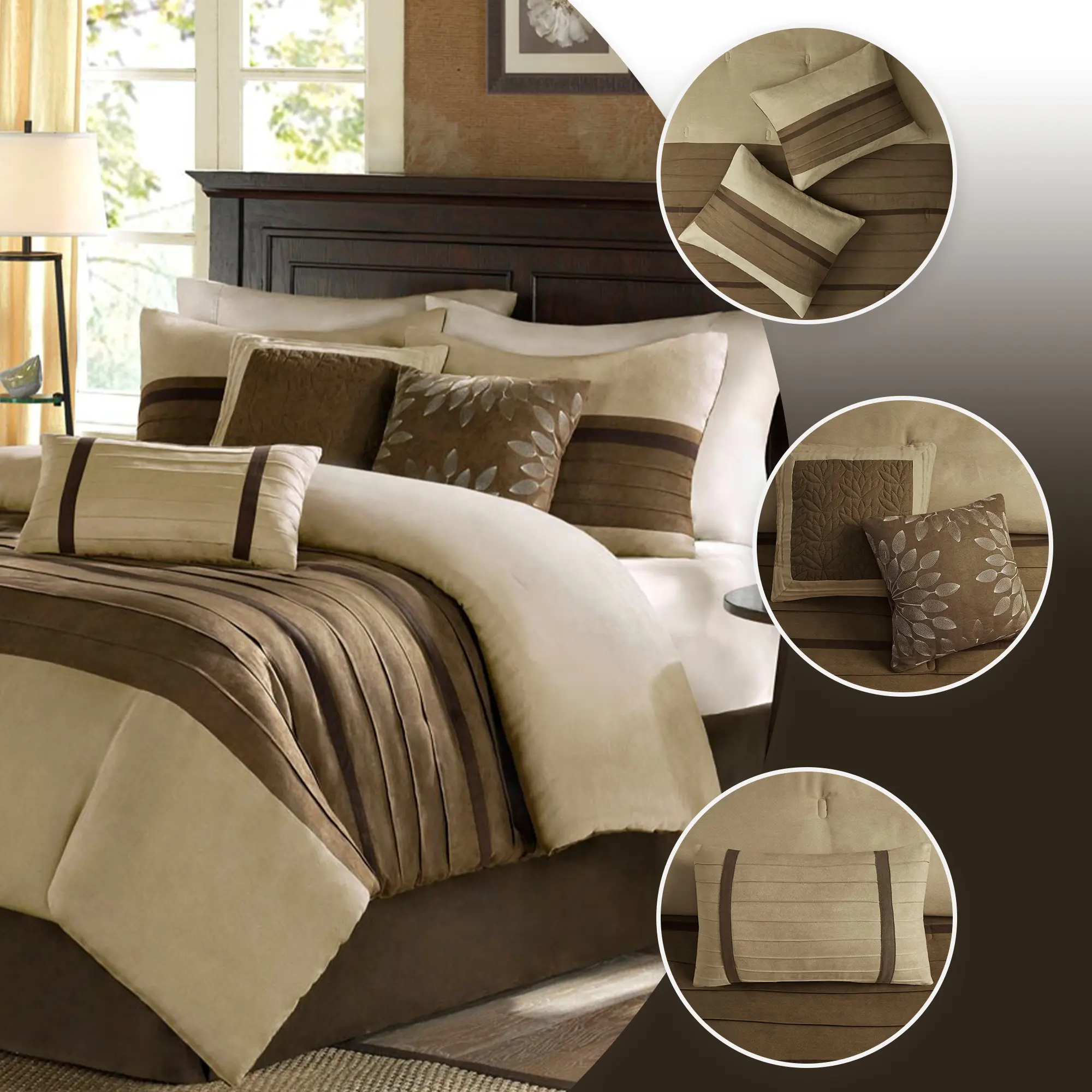 β’ Transitional style faux suede 7 piece comforter set