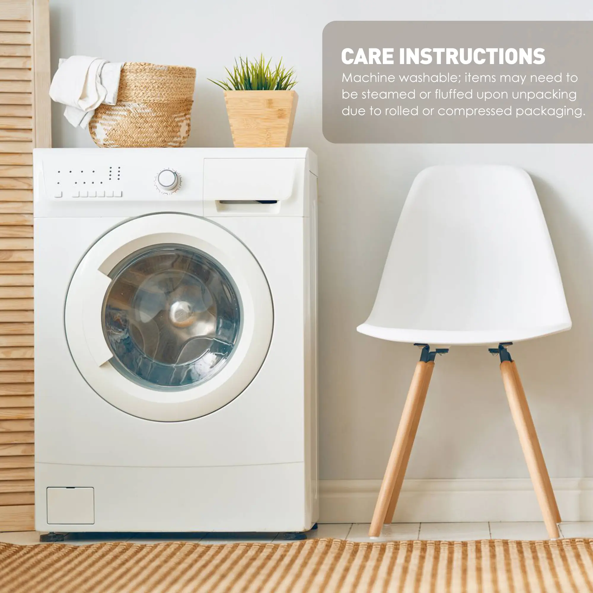 Machine washable for easy care, items in the set may come in a rolled or compressed packaging, which will need to be fluffed up or steam ironed before use to remove wrinkles.