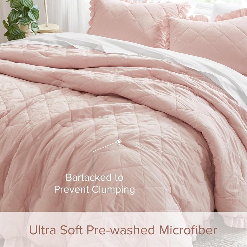 Snuggle up to our soft pre-washed bedding set. It features a top-quilted diamond patterning and ruffled edges. Designed with a weightier touch for an extra silky feel, this comforter is perfect for all seasons. The set includes a fluffy comforter and overlapping shams, adding a touch of elegance to your bedroom.