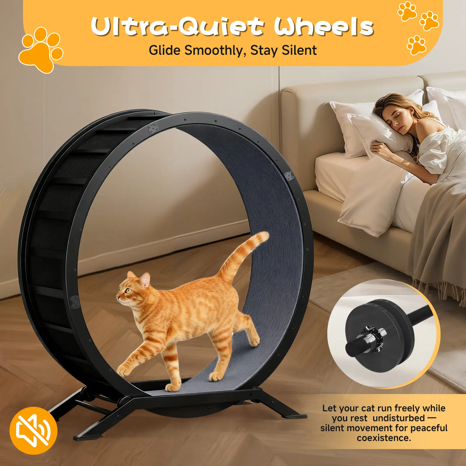·Near-Silent Operation with Integrated Safety Lock Distinguished by its exceptionally quiet roller mechanism, the cat exercise wheel ensures virtually noiseless performance during your cat's runs, allowing for undisturbed rest even with nighttime activity. The integrated safety lock feature empowers you to manage play sessions effectively. By engaging the lock when the house is unattended, you can prevent any potential incidents from unsupervised use, adding an essential layer of security.