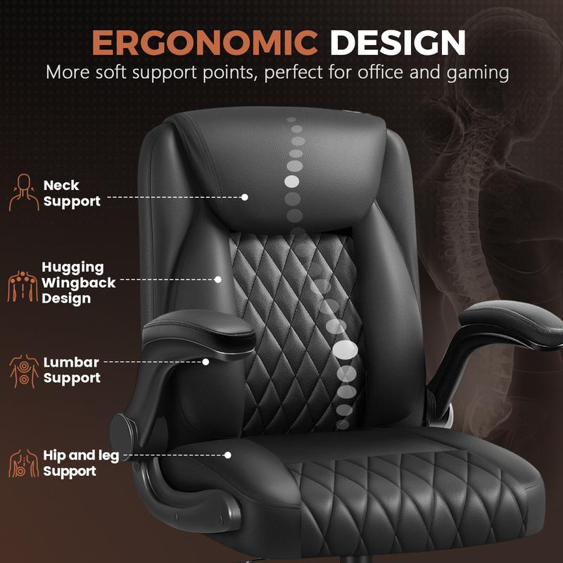 ·【Ergonomic Design】The COMHOMA computer chair features built-in lumbar support, a mid-back height, and a winged backrest to ease back pain from long gaming or work sessions. Diamond-stitched leather keeps it breathable, and the 90° flip-up adjustable armrests add flexibility. A sturdy metal base, high-strength elastic webbing, and foam create an innovative cushion that won't sink over time.