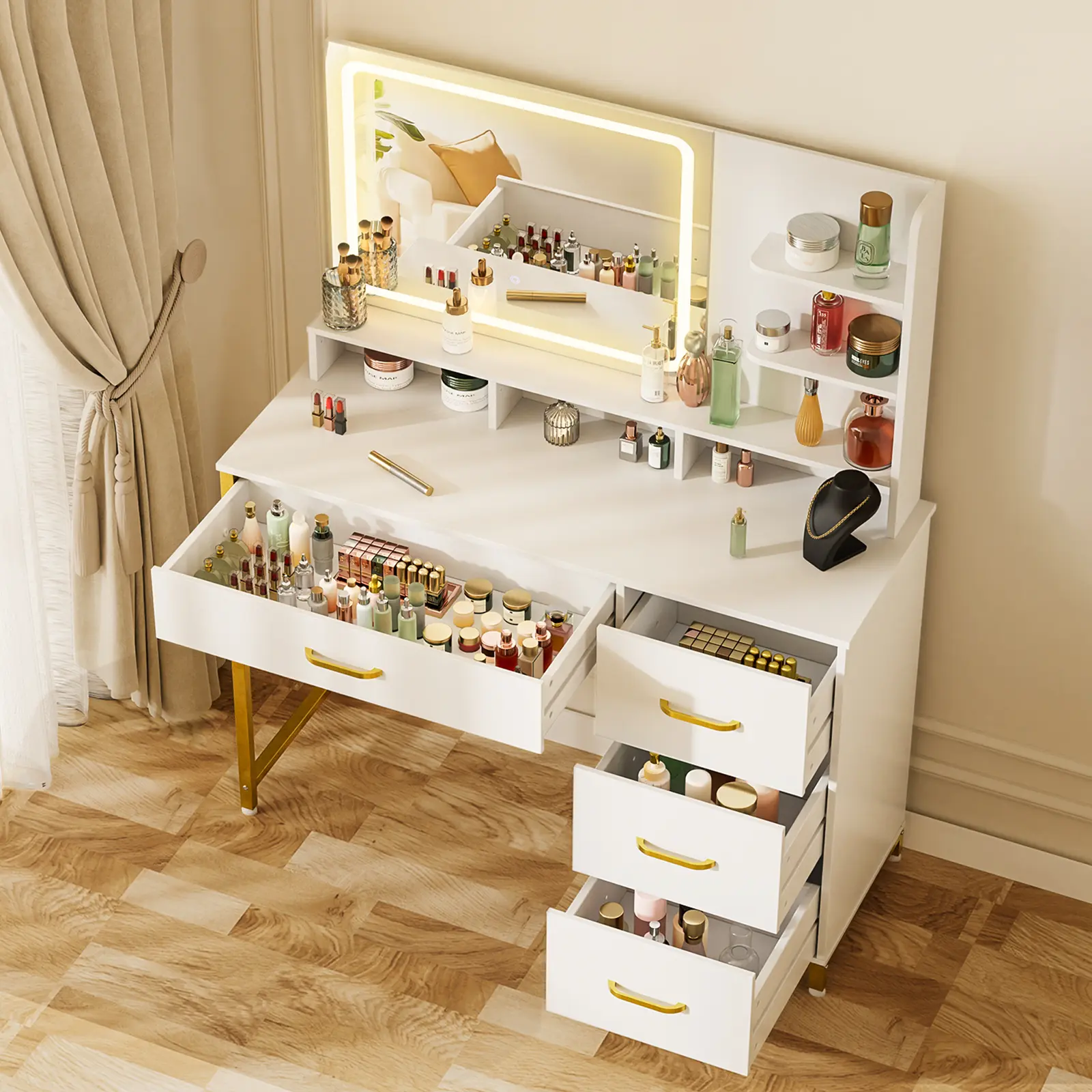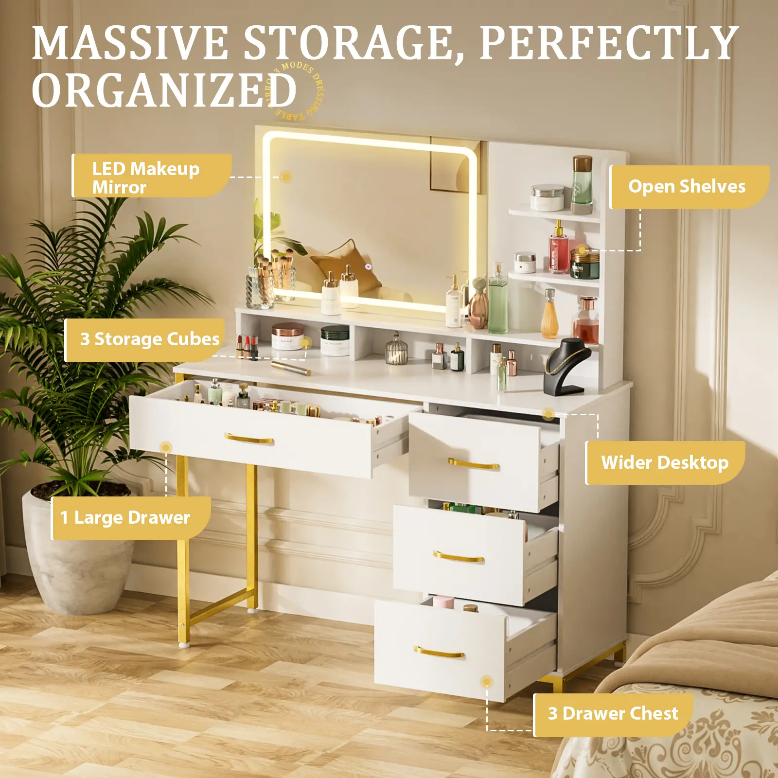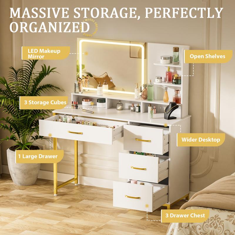 ·【Space Manager】Do you always feel like you don't have enough space on your desk when you're doing your makeup? To solve your worries, we have prepared this makeup vanity for you, which has 4 drawers and 6 open storage spaces, which can easily help you hold all your cosmetics, hair products, and body care products and store them safely