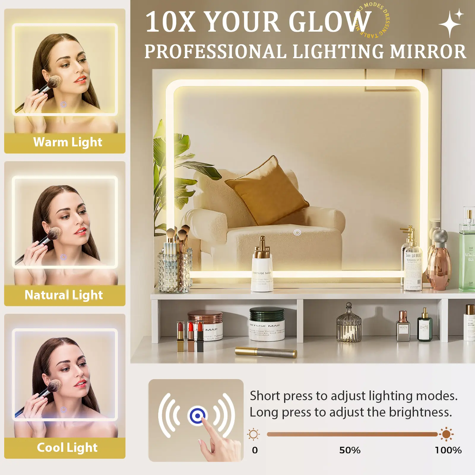 ·【Large Mirror with 3 Color Lighting Modes】Large HD mirror make sure you look great from every angle, with new upgrade touch screen switch, the vanity table is equipped with three colors of adjustable LED lights: warm yellow, warm white, and cool white, the brightness of which can be adjusted according to different scenarios and makeup needs at the push of a switch