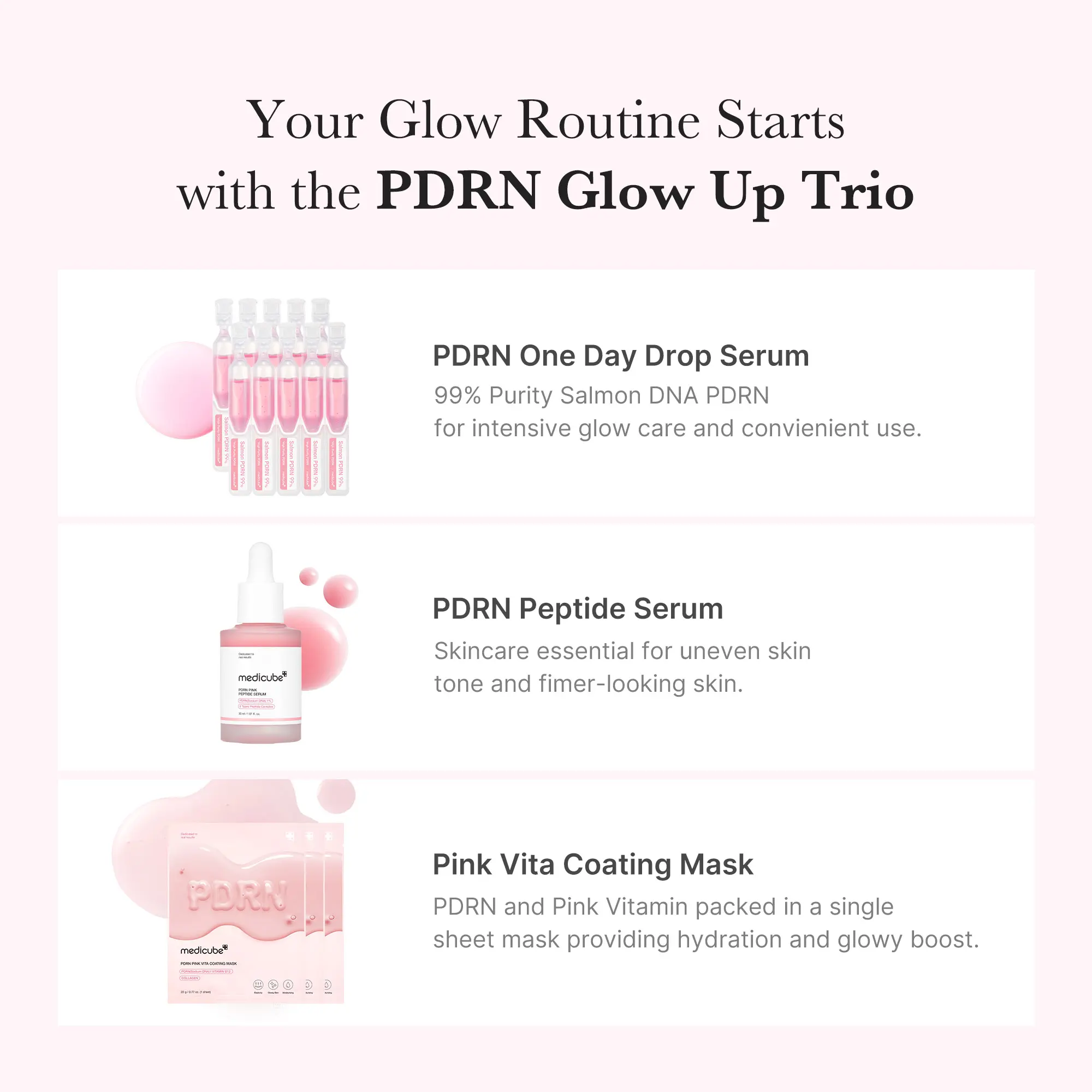 Your favorite glow-boosting essentials, now in one ultra-value set. Featuring our best-selling PDRN serums and sheet masks, this curated trio delivers smoother texture, brighter tone, and intense hydration—all in one pink package.