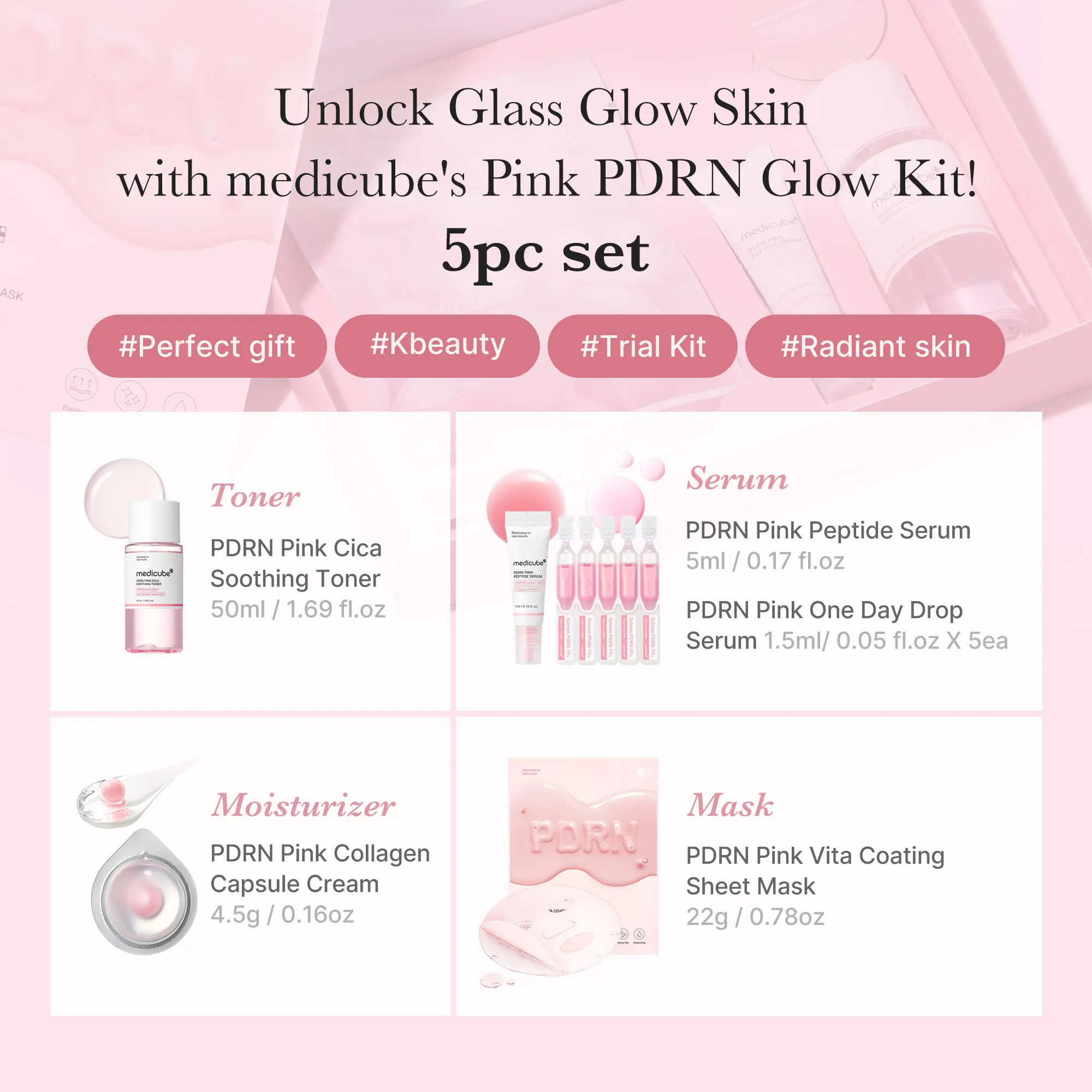 Experience radiant, hydrated skin with our most-loved PDRN formulas—now in a trial-sized kit perfect for gifting, travel, or just discovering your next skincare staple. Unlock glass glow skin with medicube’s Pink PDRN.