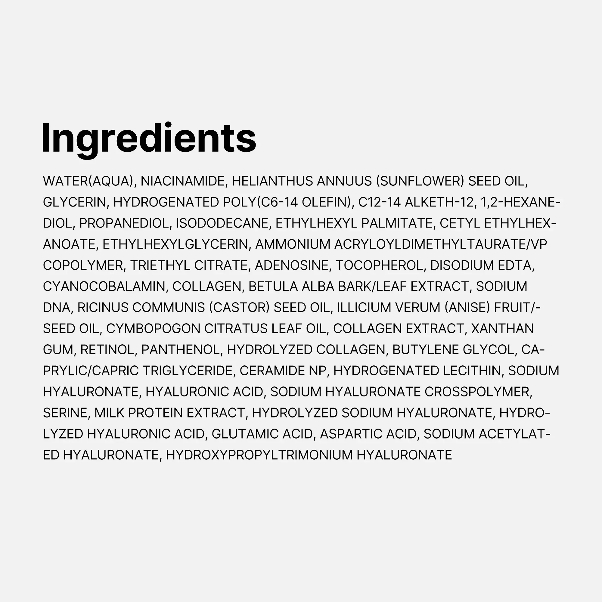 | Ingredients | WATER(AQUA),NIACINAMIDE,HELIANTHUS ANNUUS (SUNFLOWER) SEED OIL,GLYCERIN,HYDROGENATED POLY(C6-14 OLEFIN),C12-14 ALKETH-12,1,2-HEXANEDIOL,PROPANEDIOL,ISODODECANE,ETHYLHEXYL PALMITATE,CETYL ETHYLHEXANOATE,ETHYLHEXYLGLYCERIN,AMMONIUM ACRYLOYLDIMETHYLTAURATE/VP COPOLYMER,TRIETHYL CITRATE,ADENOSINE,TOCOPHEROL,DISODIUM EDTA,CYANOCOBALAMIN,COLLAGEN,BETULA ALBA BARK/LEAF EXTRACT,SODIUM DNA,RICINUS COMMUNIS (CASTOR) SEED OIL,ILLICIUM VERUM (ANISE) FRUIT/SEED OIL,CYMBOPOGON CITRATUS LEAF OIL,COLLAGEN EXTRACT,XANTHAN GUM,RETINOL,PANTHENOL,HYDROLYZED COLLAGEN,BUTYLENE GLYCOL,CAPRYLIC/CAPRIC TRIGLYCERIDE,CERAMIDE NP,HYDROGENATED LECITHIN,SODIUM HYALURONATE,HYALURONIC ACID,SODIUM HYALURONATE CROSSPOLYMER,SERINE,MILK PROTEIN EXTRACT,HYDROLYZED SODIUM HYALURONATE,HYDROLYZED HYALURONIC ACID,GLUTAMIC ACID,ASPARTIC ACID,SODIUM ACETYLATED HYALURONATE,HYDROXYPROPYLTRIMONIUM HYALURONATE |