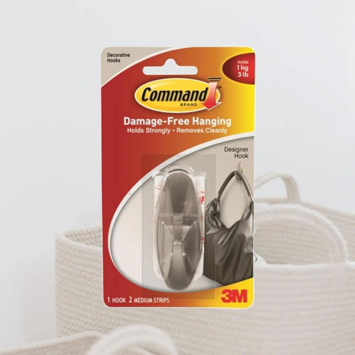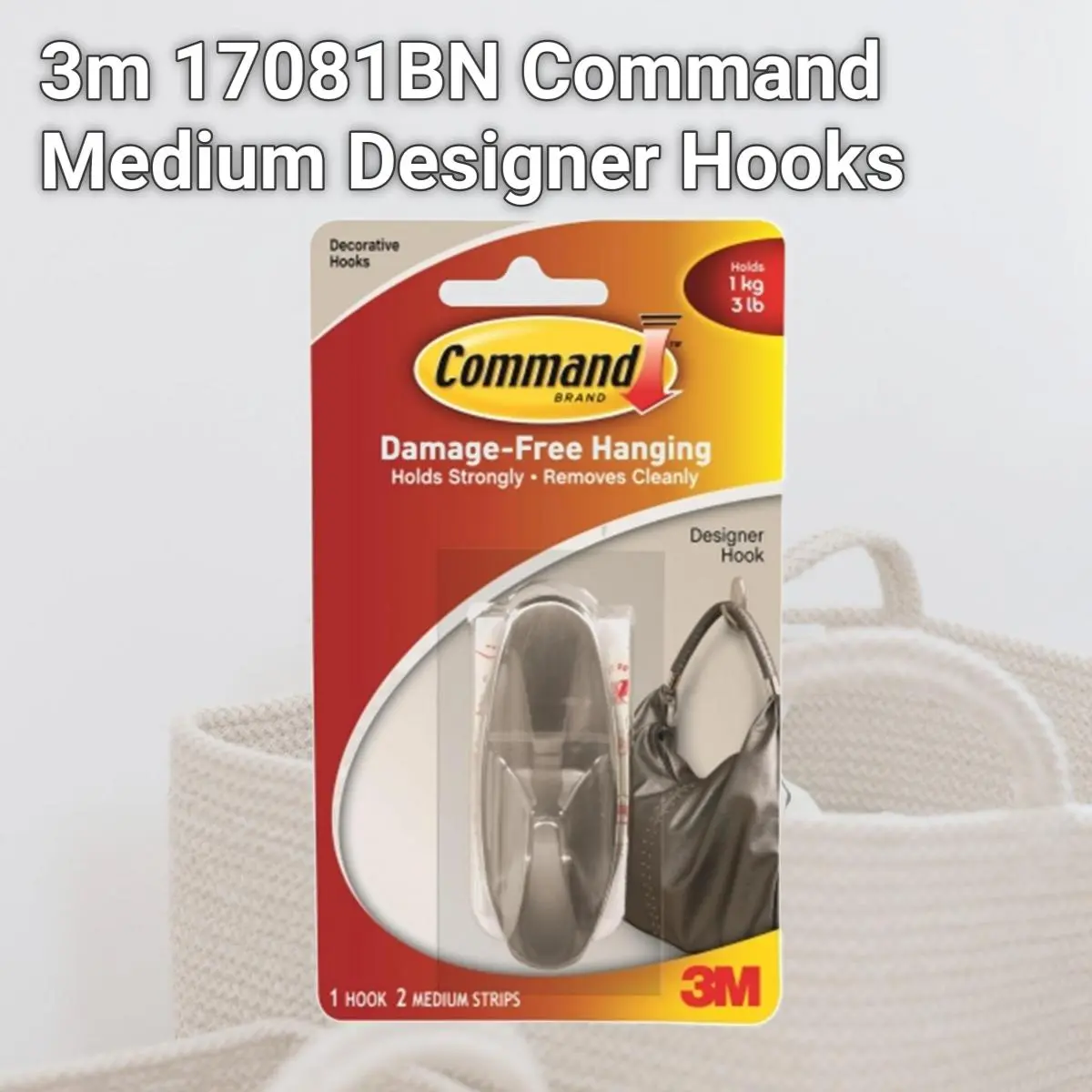 Medium hooks The mounting solution that holds firmly and removes cleanly Leaves no surface damage Reusable Each hook holds up to 3 lbs. Includes 1 hooks and 2 adhesive strips Carded Length: 1.5 Width: 3.88 Height: 6.8