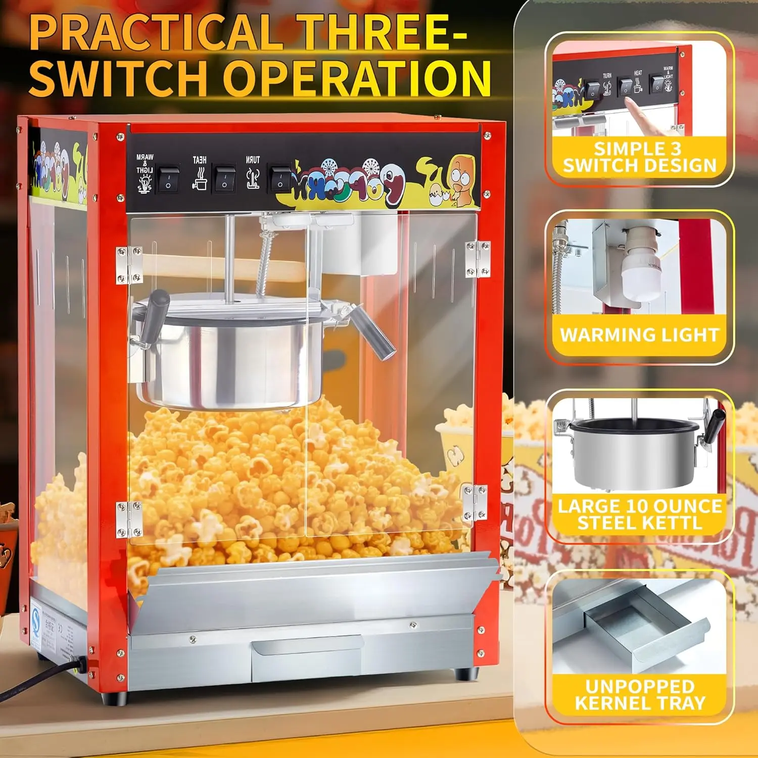 Commercial Popcorn Machine, 10 Oz Kettle, 1300W Countertop Popcorn Maker for 60 Cups per Batch, Movie Theater Popcorn Popper with 3-Switch Control, 2 Scoops 1 Cup, Red (18.5''L*12.8''W*25.8''H)Commercial Popcorn Machine, 10 Oz Kettle, 1300W Countertop Popcorn Maker for 60 Cups per Batch, Movie Theater Popcorn Popper with 3-Switch Control, 2 Scoops 1 Cup, Red (18.5''L*12.8''W*25.8''H)Commercial Popcorn Machine, 10 Oz Kettle, 1300W Countertop Popcorn Maker for 60 Cups per Batch, Movie Theater Popcorn Popper with 3-Switch Control, 2 Scoops 1 Cup, Red (18.5''L*12.8''W*25.8''H)Commercial Popcorn Machine, 10 Oz Kettle, 1300W Countertop Popcorn Maker for 60 Cups per Batch, Movie Theater Popcorn Popper with 3-Switch Control, 2 Scoops 1 Cup, Red (18.5''L*12.8''W*25.8''H)