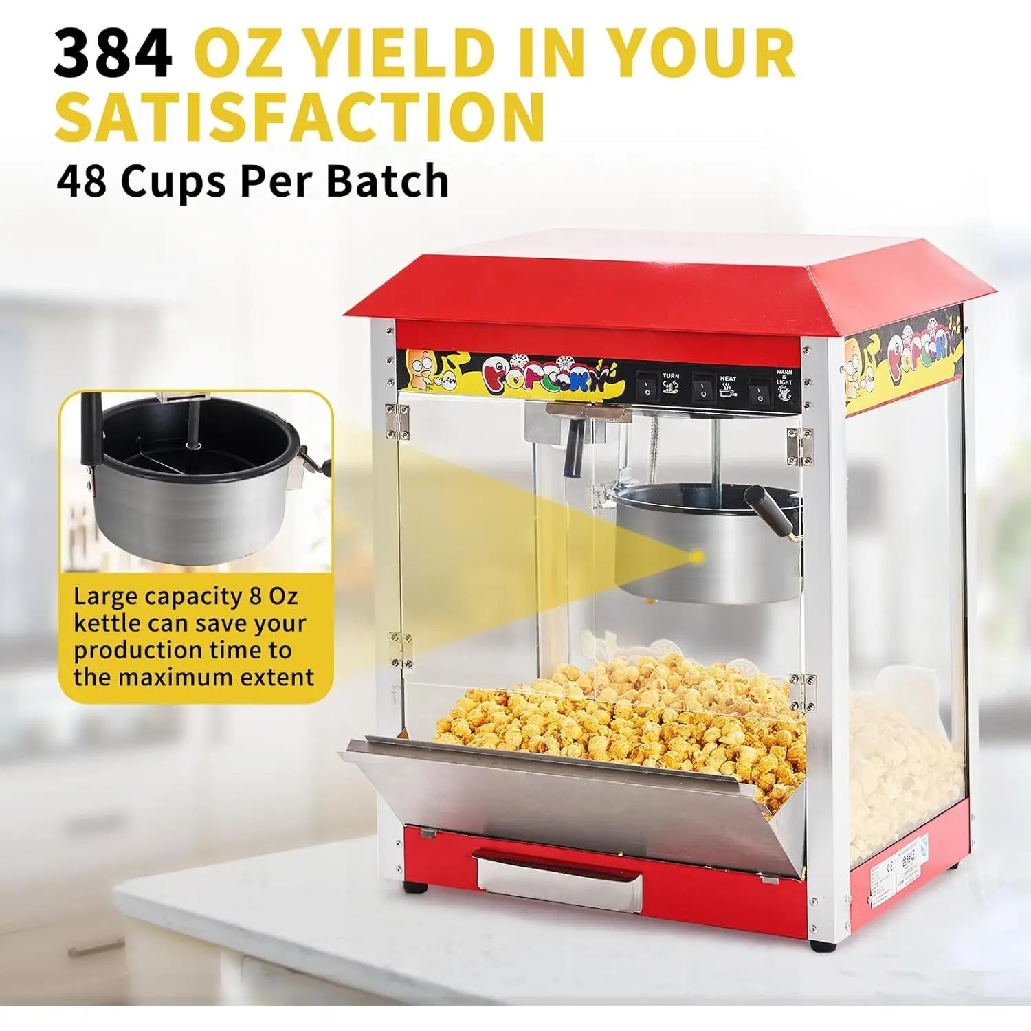 The 10oz large capacity Non-Stick kettle pops 48 cups of popcorn per batch (approximately 384 ounces) to meet your needs and serve your guests better.