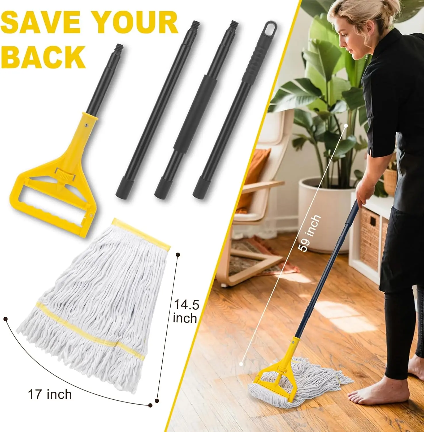 This commercial mop features three large 16oz cotton mop heads with looped ends to prevent tangling and fraying, extending mop life.