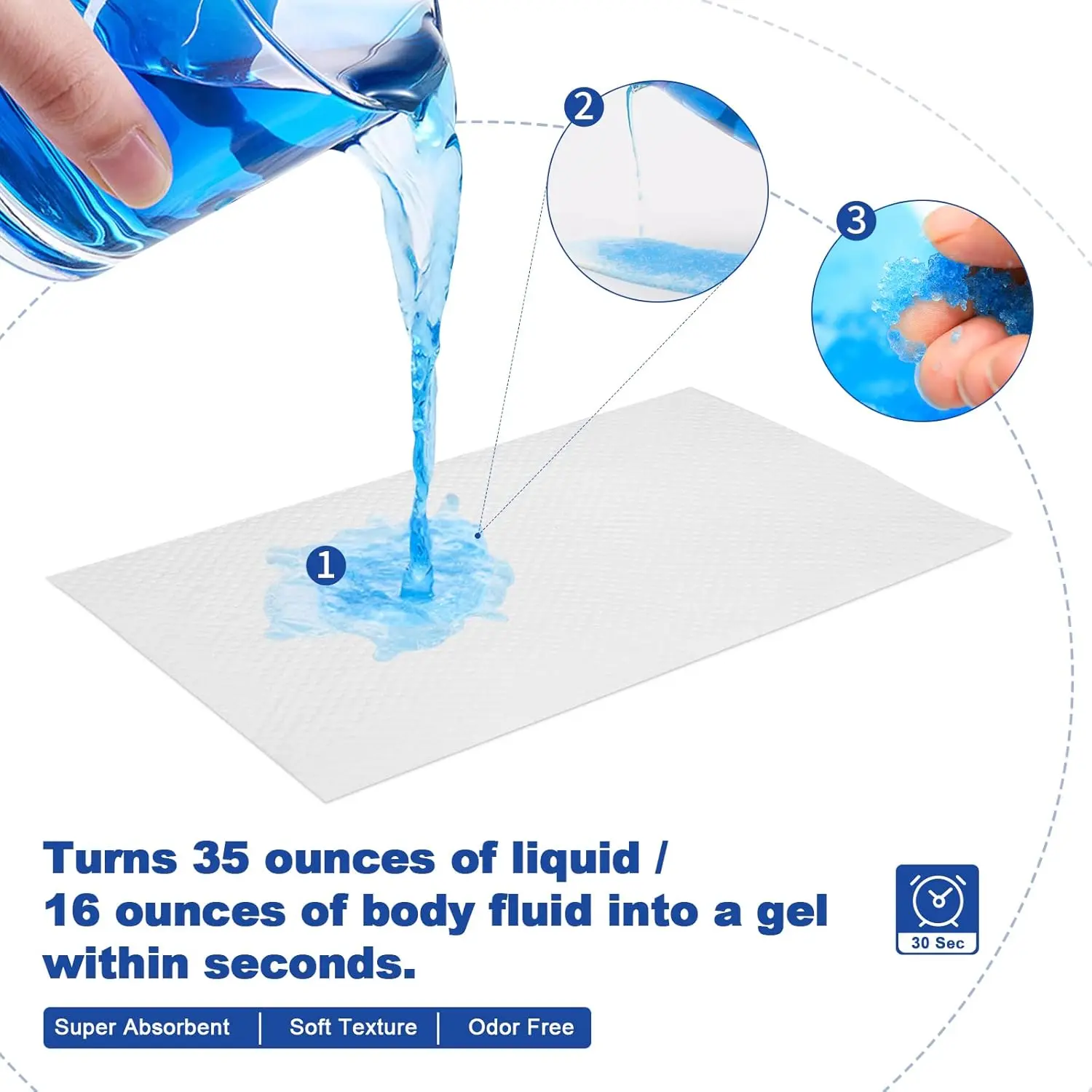 Super Absorbent & Eliminate Spills: The absorbent pads measured 9.5 x 5 inches, which allow liquids to solidify without worrying about spills.They solidify 35 OZ (1000ML) of WATER / 16 OZ (450ML) of BODY FLUID into a gel in seconds, absorbing urine well and reducing odors