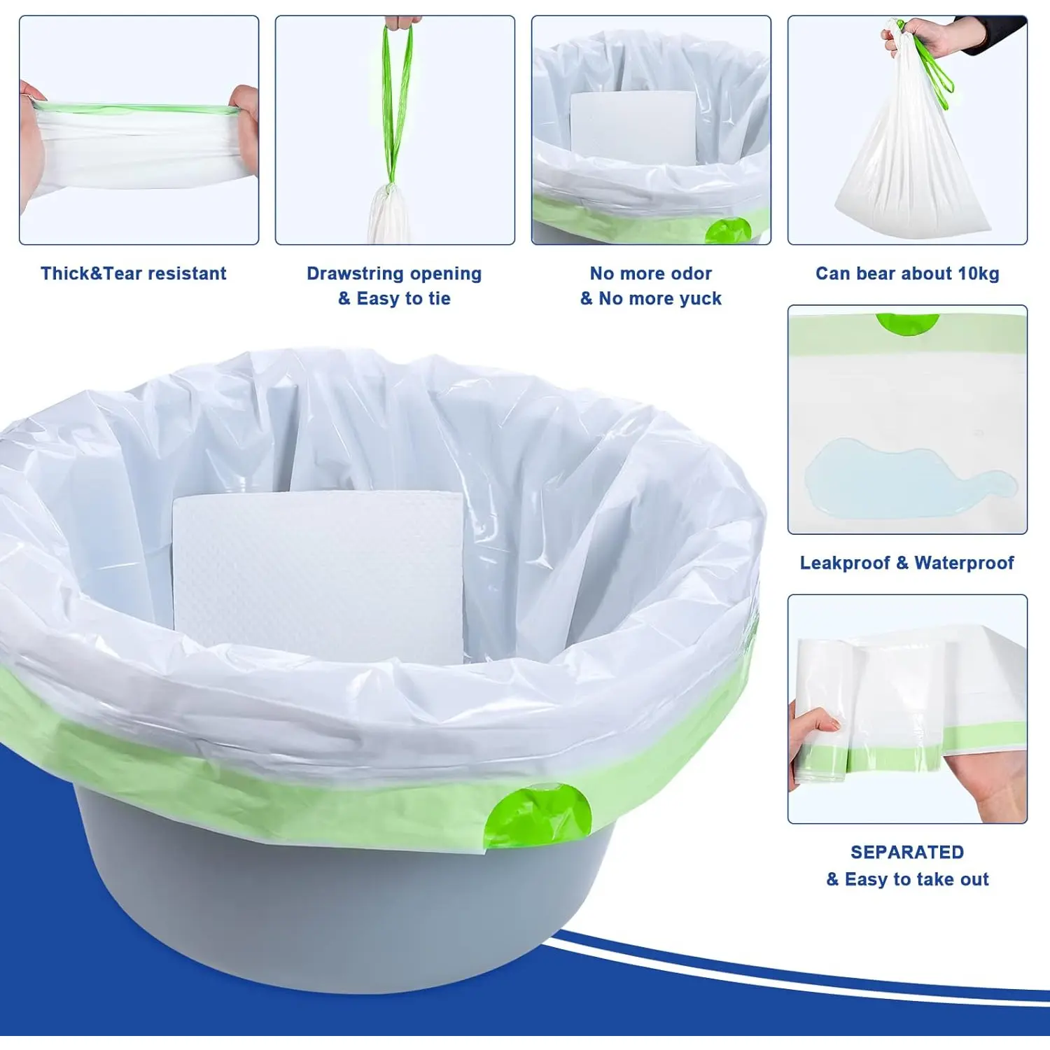 Leak Proof & No More Odor: These potty liners made of medical grade LDPE plastic.Sized is 21 x 16 inches, capacity 15 liters and can bear about 10 kg.The portable toilet liners are thick, sturdy, tear resistant, drawstring opening to easy to tie
