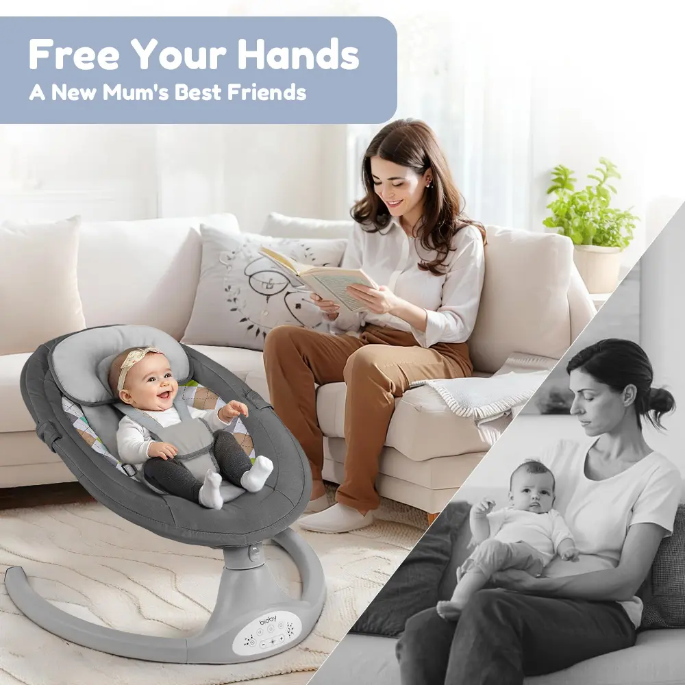 ·BT connection to a mobile phone plays nursery rhymes without restrictions. The remote control allows you to comfort your baby remotely. Three timing modes save adults' energy. 📱