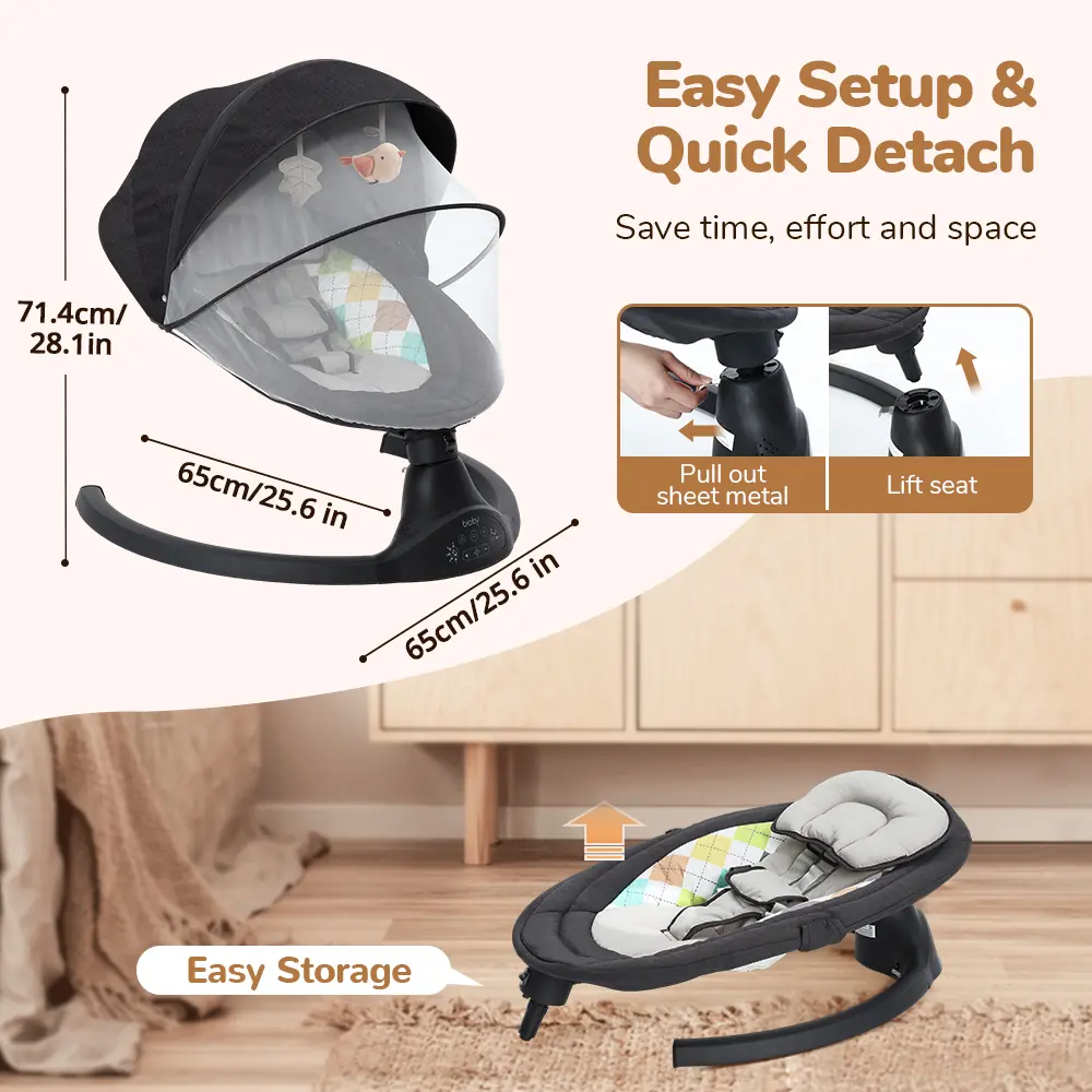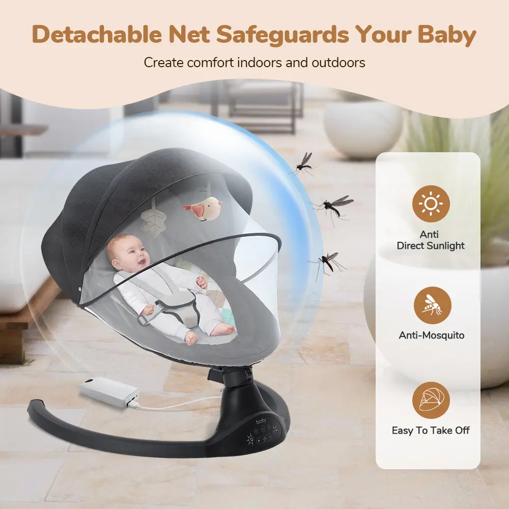 ·Portable Design: Lightweight infant swing with travel size, quick 3-minute installation, and a detachable net and canopy to protect babies.