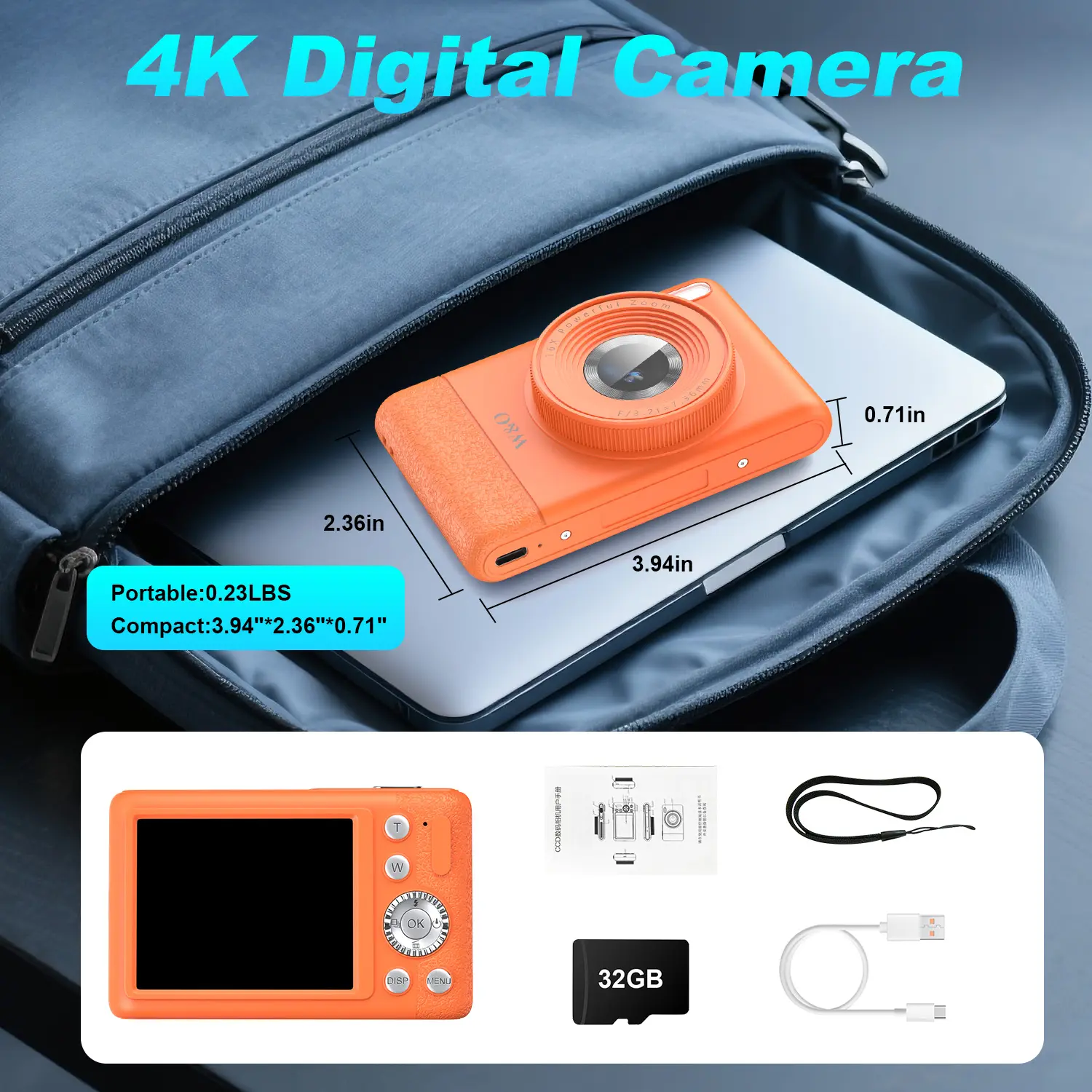 To use this 4K digital camera, first insert a 32GB memory card and secure the lanyard to prevent it from falling. After turning on the camera, adjust the angle according to the shooting scene for convenient selfies or landscape photography. When shooting 4K video or photos, lightly press the button next to the shutter to switch modes. Use the lens to adjust the focus and capture both distant and close-up scenes. After shooting, you can quickly transfer the 4K footage from the 32GB memory card to your computer for editing and sharing. This allows you to easily capture life in 4K quality and create your own unique visuals. You can also refer to the user manual for more convenient use.