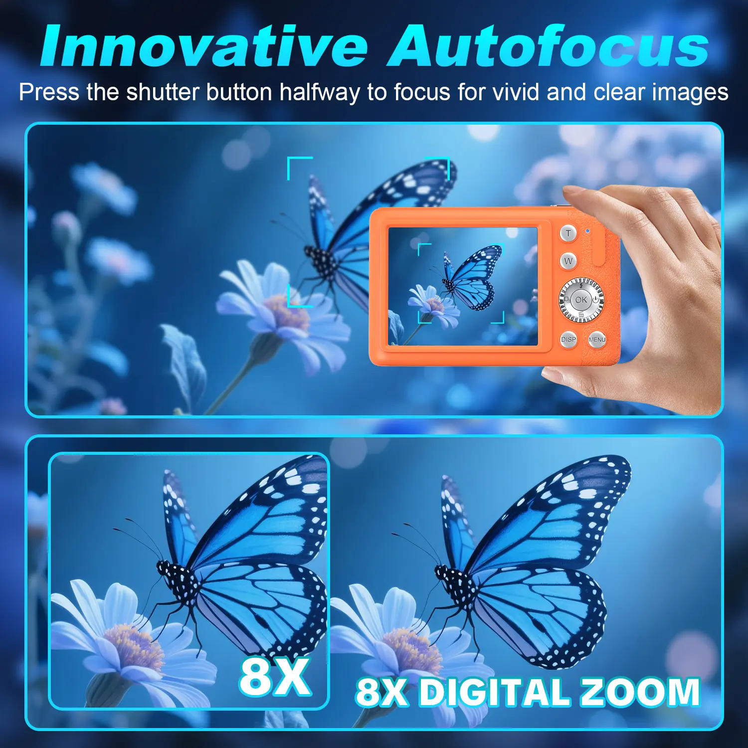 Say goodbye to blurry images! The upgraded precise autofocus function perfectly tracks your movements, whether you're moving or posing. The vlogging camera features a compact design with a 2.8-inch LCD screen, allowing you to view yourself in real-time and easily capture the perfect angle for vlogs, live streams, or Instagram selfies. This is the best camera choice for content creators. This compact autofocus camera takes excellent photos, allowing you to shoot freely. The 4K digital camera features a large 2.8-inch screen for easy operation and full functionality, enabling you to create high-quality content while relaxing.