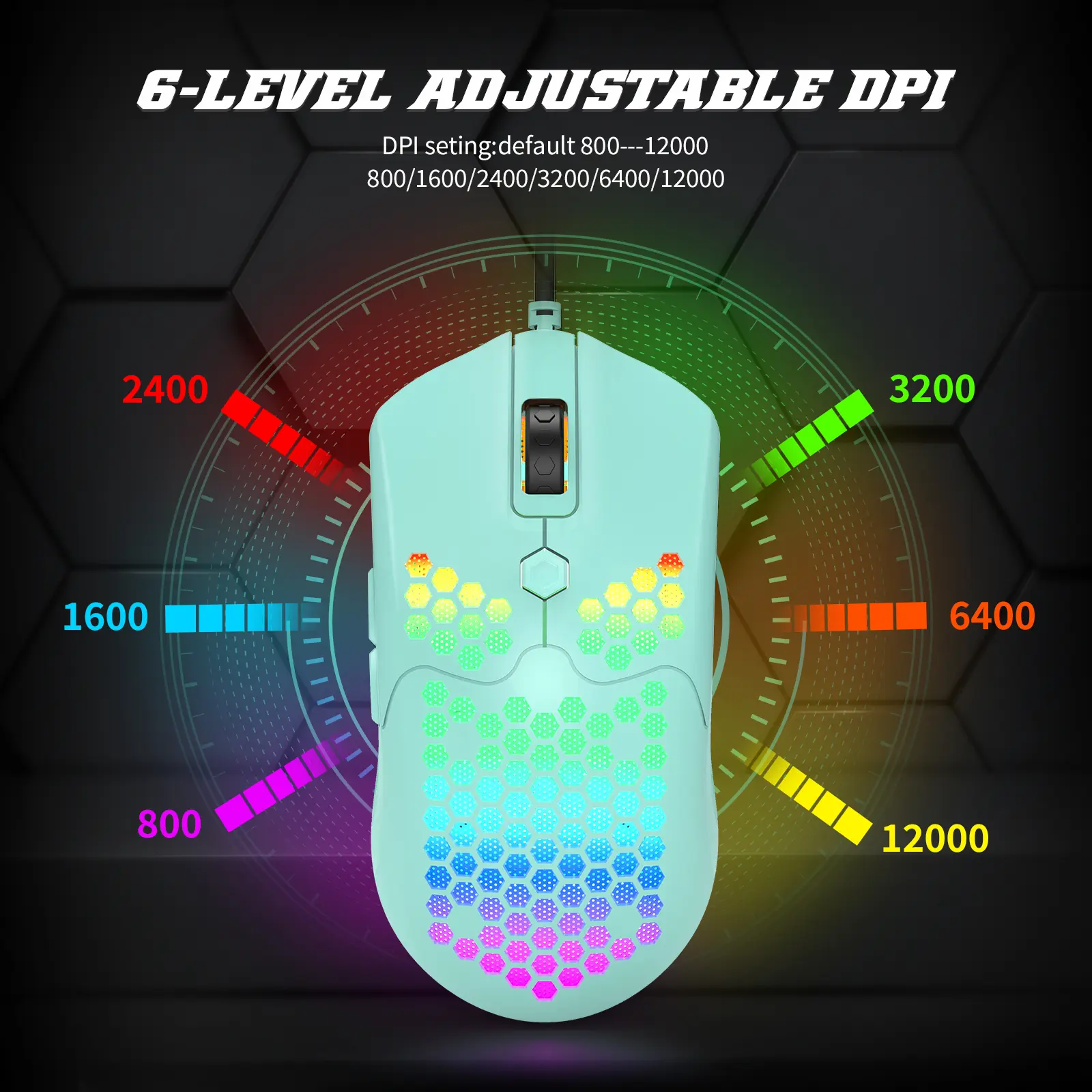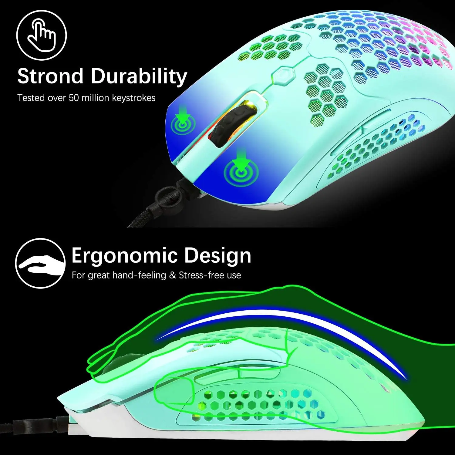 【Ultra-Lightweight Gaming Mouse】The gaming mouse features an ultra-light honeycomb shell design, weighing only 65g, reducing hand fatigue during long gaming sessions. Designed with a flexible lightweight cable and 7 programmable buttons to suit different play styles.