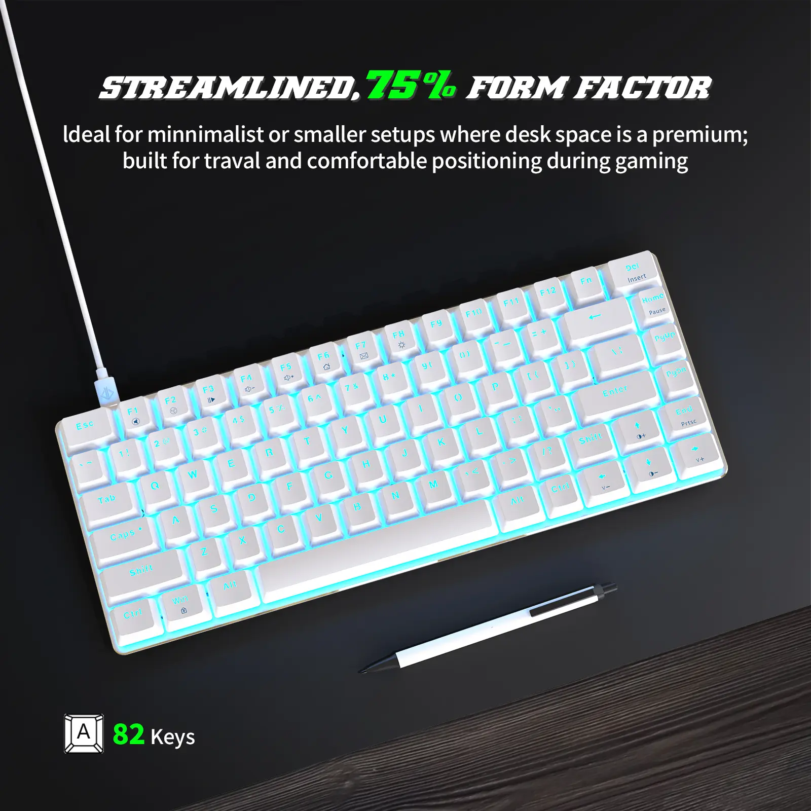 【82-Key Compact Mechanical Keyboard】This compact 82-key mechanical keyboard features a space-saving layout (12.2 × 4.72 inches) while retaining all essential keys for efficient typing and gaming. The reduced footprint keeps your desk clean and organized. Plug-and-play USB connection makes it easy to use at home or in the office.