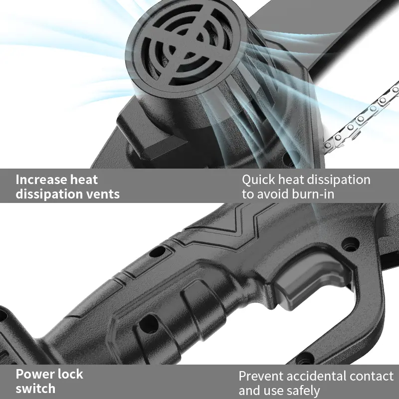 Rechargeable Battery: Lithium Battery Safe Protection: The chain saw has a safety switch, so that you need to hold down the switch and press the trigger simultaneously to start the machine. 90° Rotatable bezel can prevent splash fragments. We also offer 1 pair of gloves to protect your hands and 1 pair of goggles to protect your eyes during trimming.