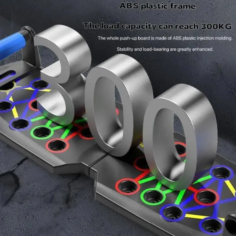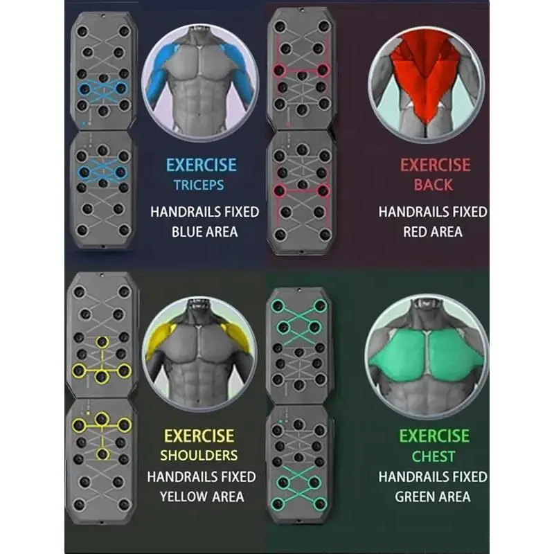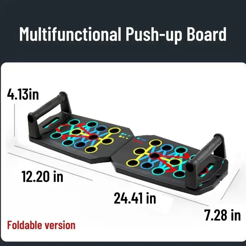 The image shows a foldable push-up board with color-coding. It is portable and designed for chest, arms, and core workouts.