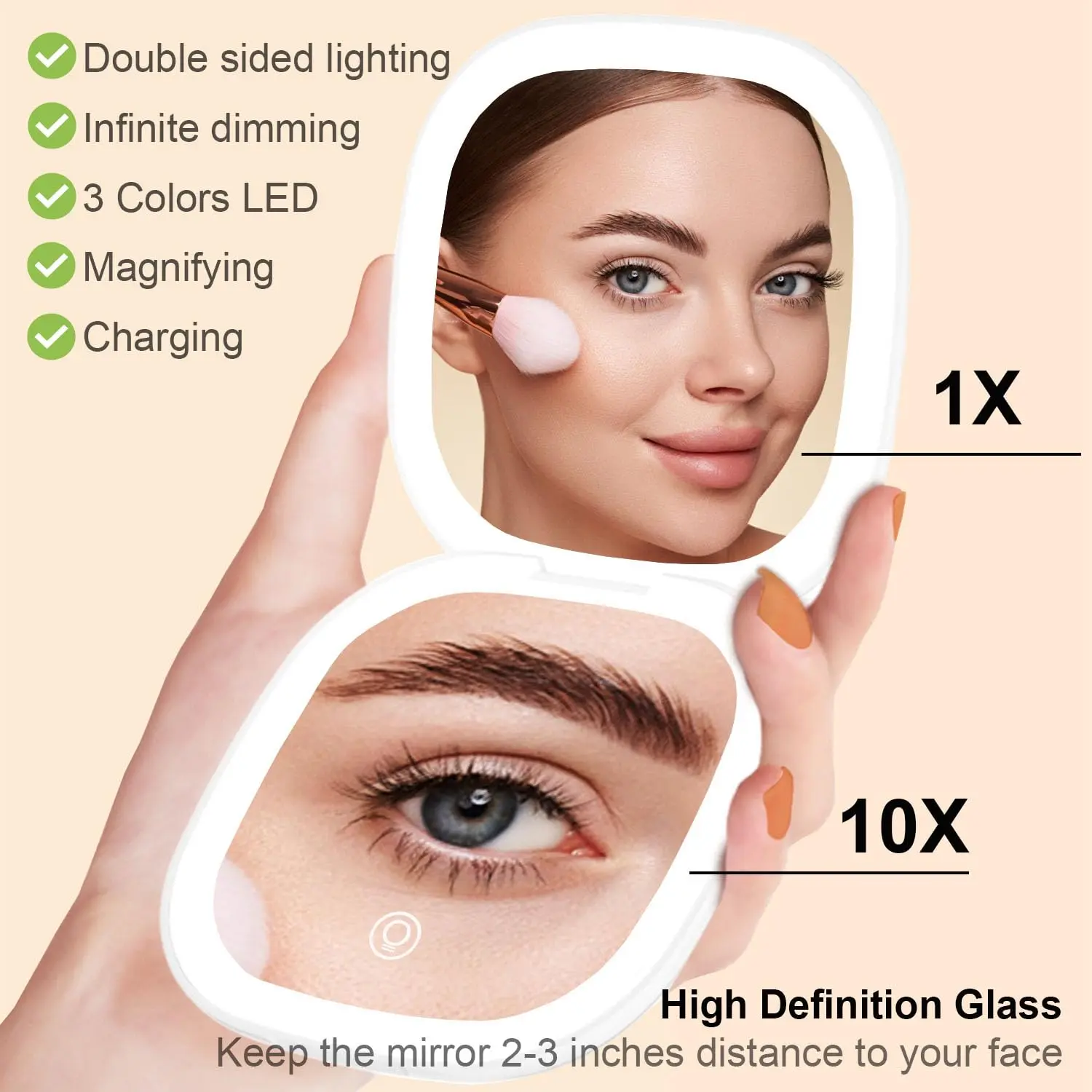 2-Sided Lighted Makeup Mirror - With 3 dimmable light settings (white,warm and natural daylight) to ensure that your makeup is color-correct and flawless anywhere, anytime.