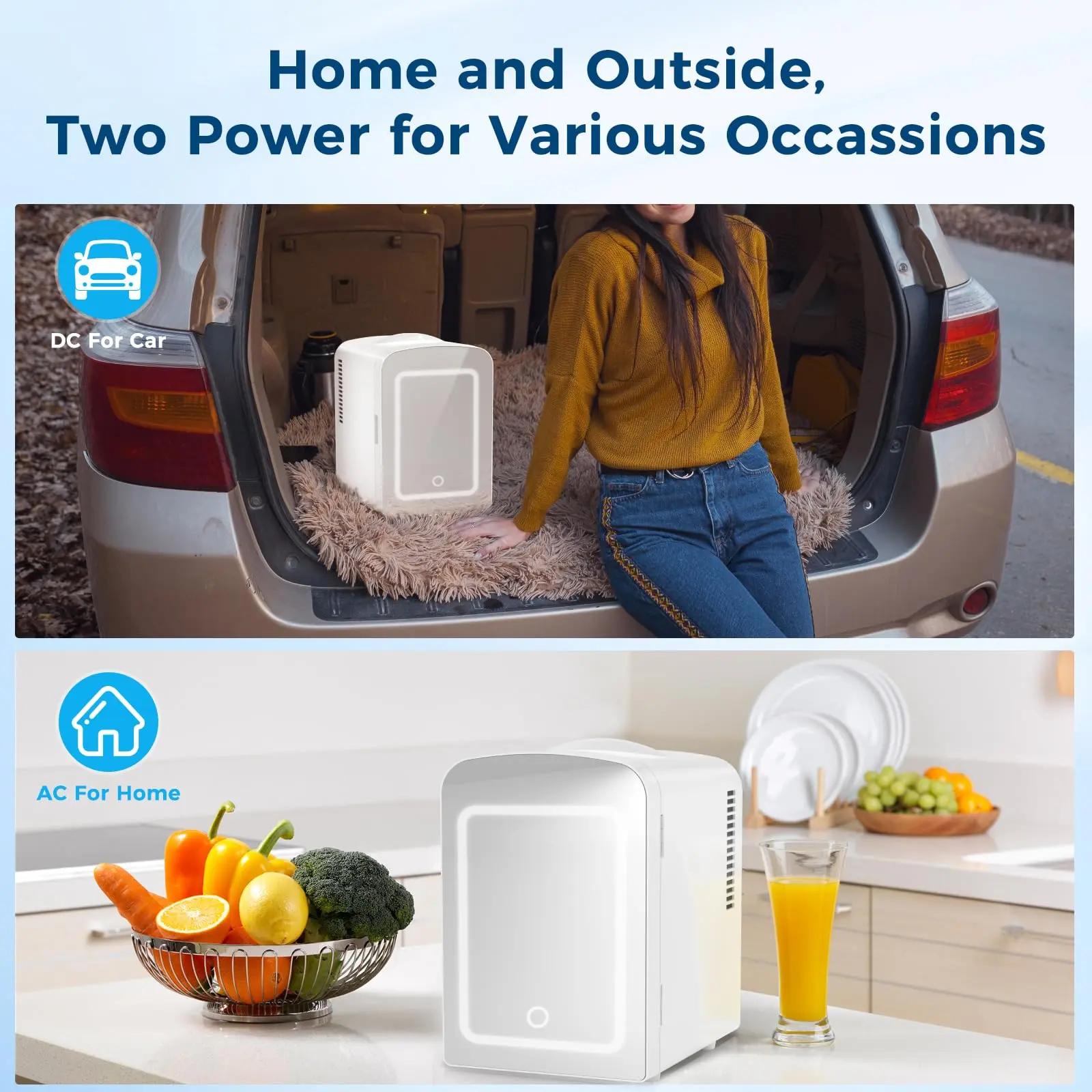 AC/DC SUPPLY OPTIONS: You can connect the compact refrigerator to a 100-120V home power supply, or you can connect to a 12V car power supply.