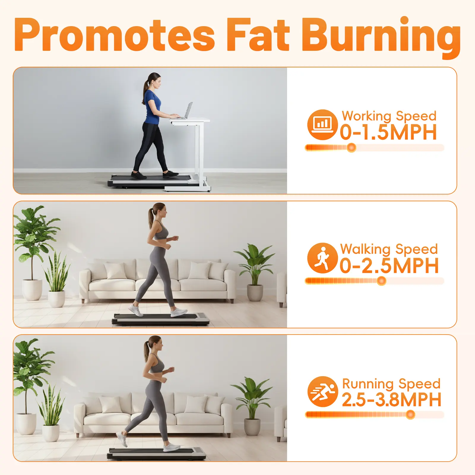 Experience smooth, quiet operation under 55 dB. Walk while you work, read, or watch TV without distraction. Adjust your pace with the included remote control (0.5-4 mph). Perfect for leisurely strolls to brisk walks.