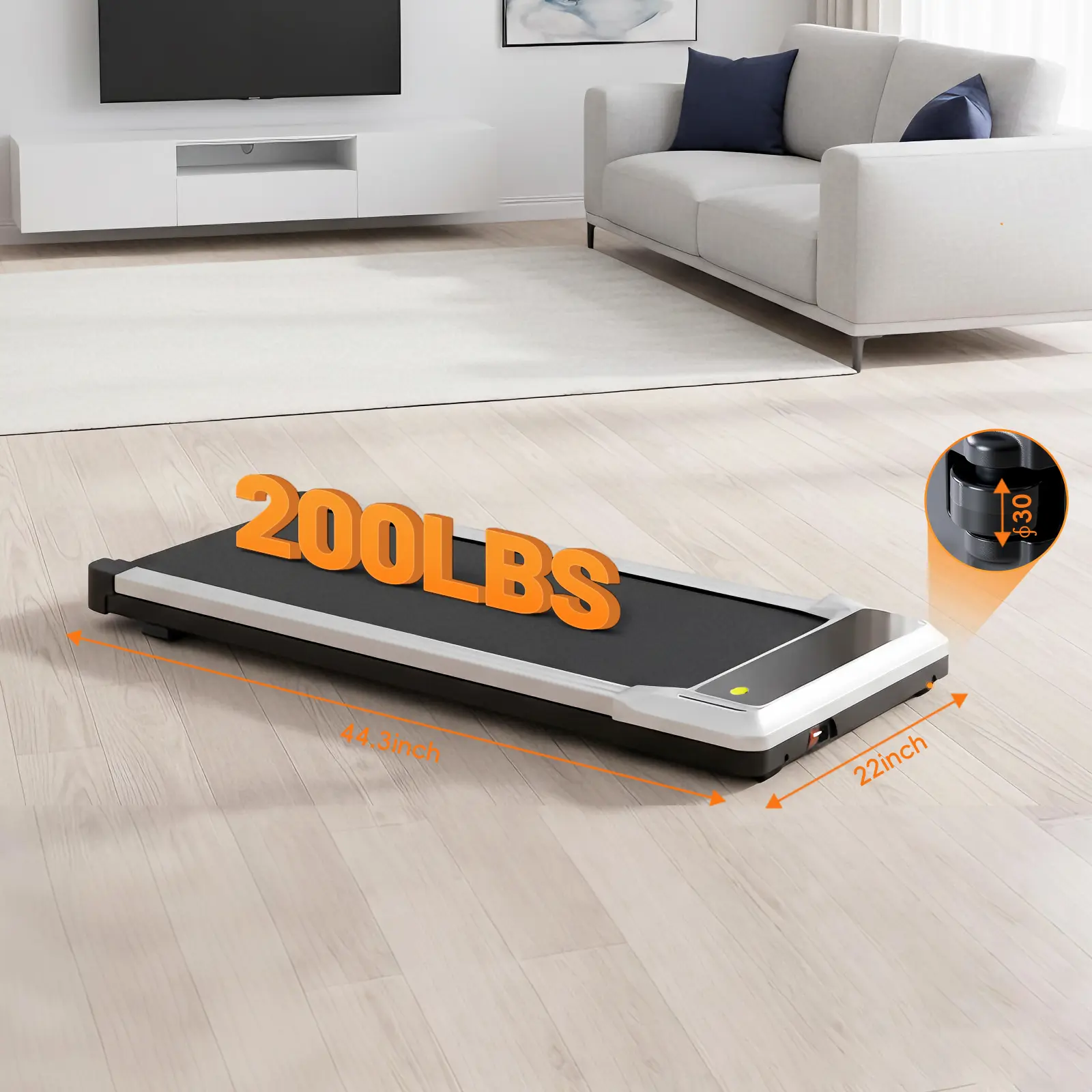 Maximize your fitness with our ultra-compact Walking Pad. This treadmill fits under any desk or bed, offering a convenient workout solution for home and office. It supports up to 220 lbs and features a non-slip surface (22" x 44.3"). Easily unfold and start walking in seconds.