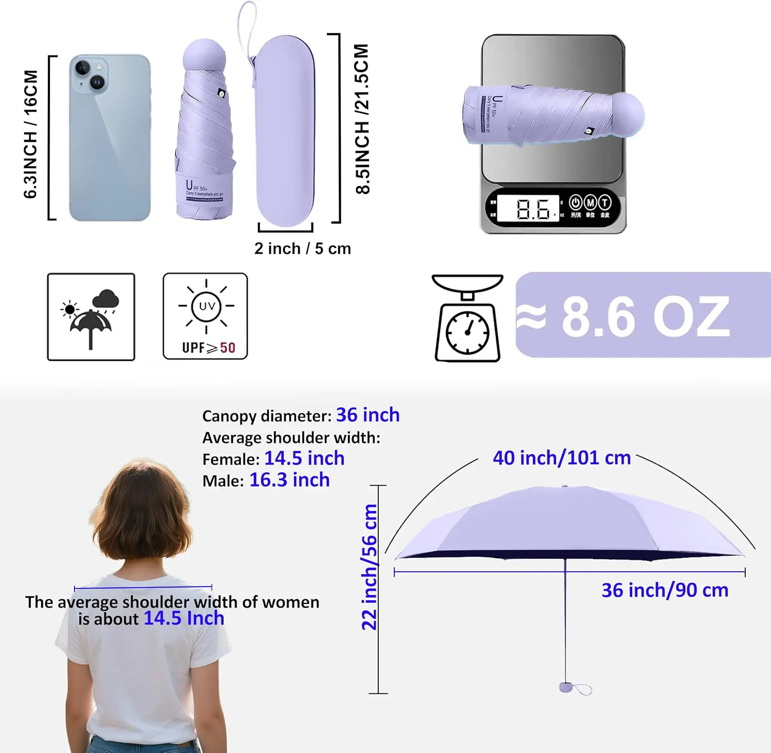 ·Pocket umbrella: With a 40-inch arc and a 35.4-inch diameter, this mini travel umbrella is perfect for concealing in your purse or bag when you’re on the go! Folds to an ultra-compact 6.9 inches, makes the umbrella great for travel, as this super lightweight umbrella collapses about the size of your palm.
