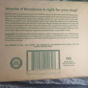 Benebone durable chew toys should be enjoyed but not eaten. While very durable, nylon bones are not a fit for extreme chewers who could damage the product or their teeth. Every dog plays differently, and since not all toys are created equal, it’s always best to keep a close watch on your pup in case things get ruff. Supervised play will help toys last longer and most importantly keep your pal safe. No dog toy is truly indestructible, so always remove the chew from playtime if pieces begin to break off. Made in a facility that processes nuts, including peanuts, so keep out of households with allergies.