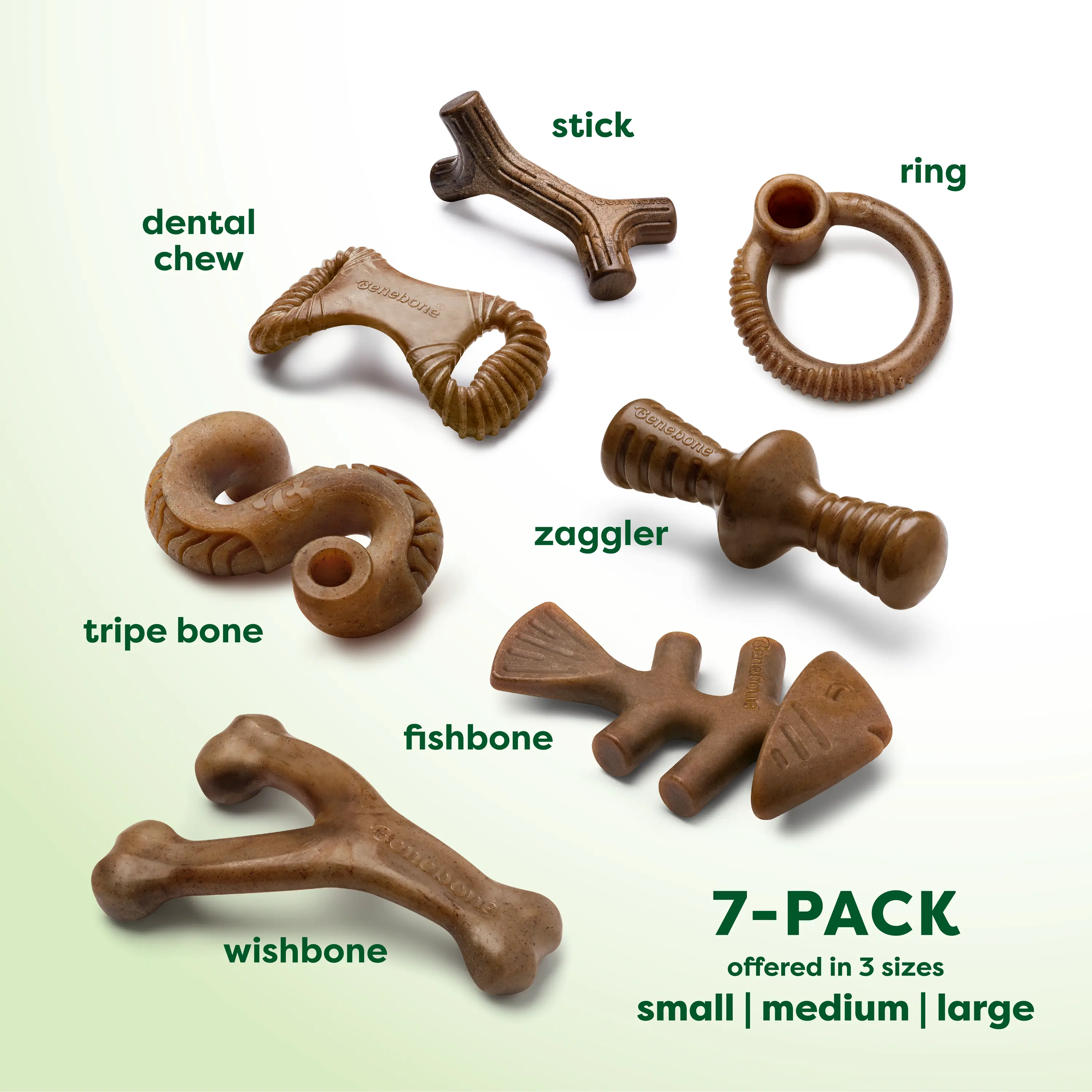 ·Wishbone – Our most popular chew toy, with real bacon flavor and an ergonomic shape dogs love.