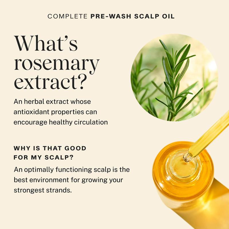 Calm itching, flaking and irritation while reducing hair breakage from root to tip with our quick and easy treatment oil powered by stimulating Rosemary Extract🌿 ✨ STRONGER LOCKS: Our breakthrough formula offers scalp soothing, clarifying and strand strengthening benefits with less hair fall and breakage. ✨ HEALTHY HAIR: Reduce hair breakage from root to tip with our quick and easy treatment oil while also clarifying to remove dirt and product buildup for a healthier, nourished scalp. ✨ MADE WITH EFFECTIVE INGREDIENTS: Our Pre-Wash Scalp Oil contains Hemisqualane to help hair health and strength instantly and over time. Rosemary Extract is known to help promote healthy circulation while Turmeric Oil can help reduce redness. ✨ HOW TO USE: Before washing hair, apply 1-3 droppers full directly to the scalp, adding more if needed. Gently massage into the scalp and leave on for 10-15 minutes. Use up to twice per week. ✨ FRESH SCENT: A cozy blend of amber and cashmere musk is brightened with a splash of lemon and mandarin.