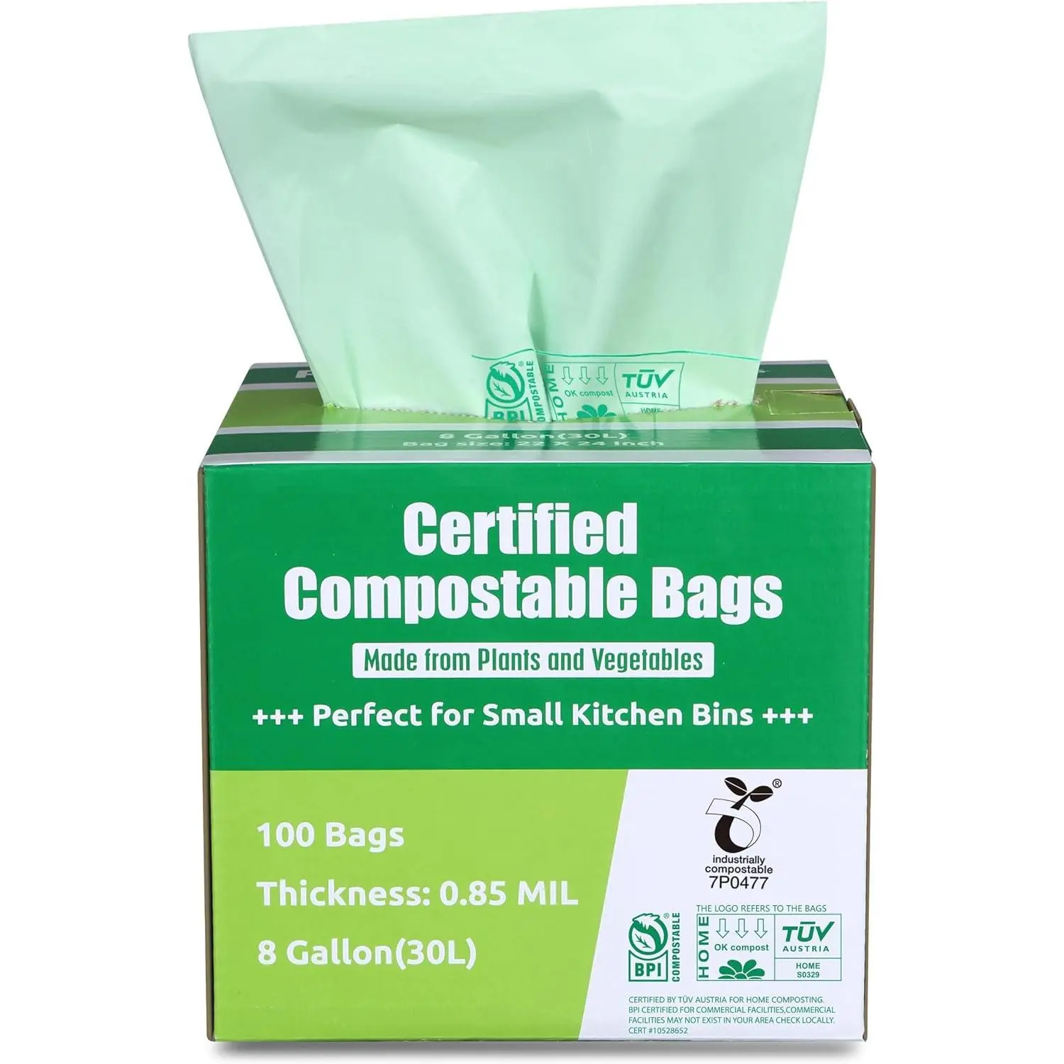 Compostable Bags, 8 Gallon (30L) Scraps Yard Bags, 100 Count, Extra Thick 0.85 Mil. ASTM D6400 Compost Bags Small Kitchen Trash Bags, Certified by BPI & TUV AUSTRIA