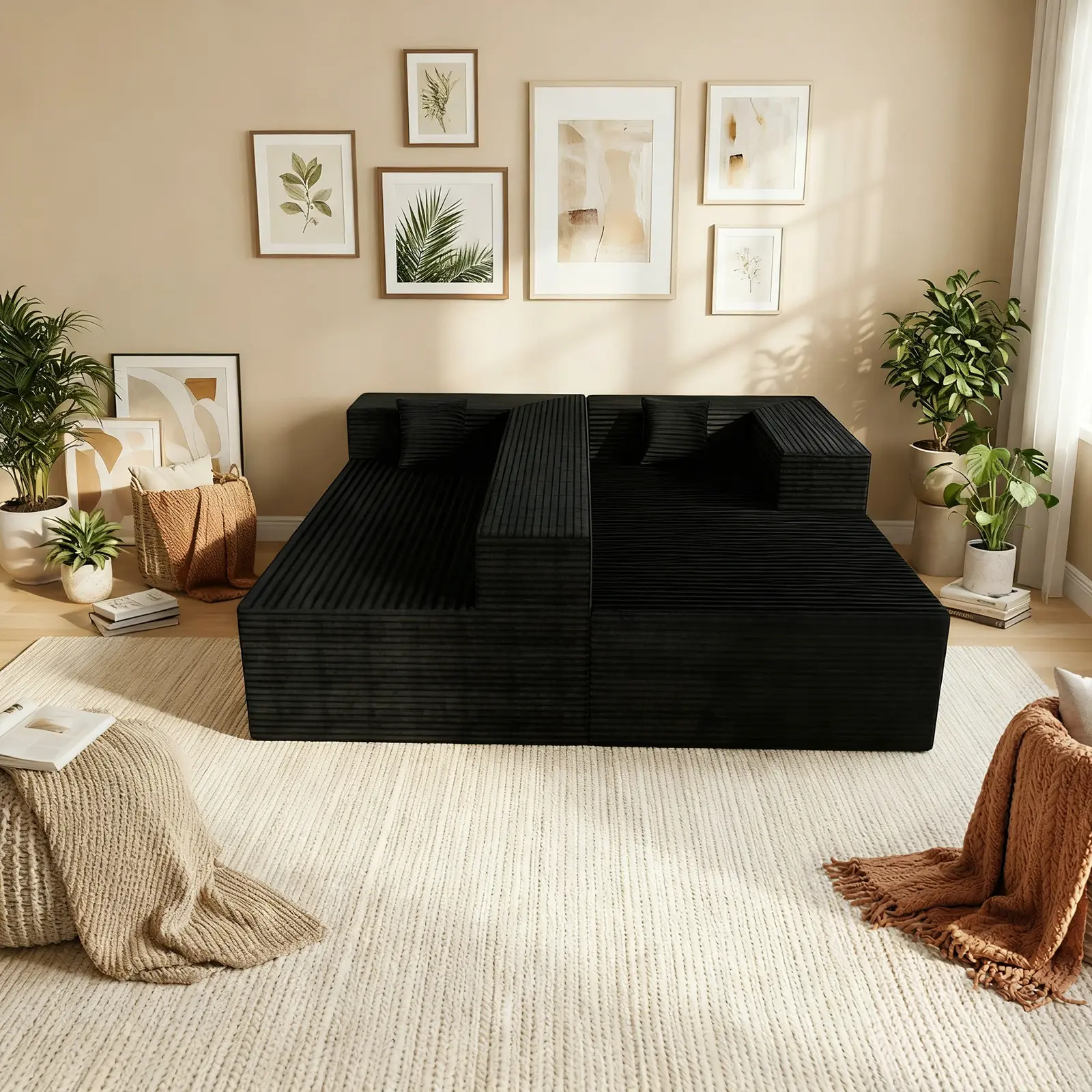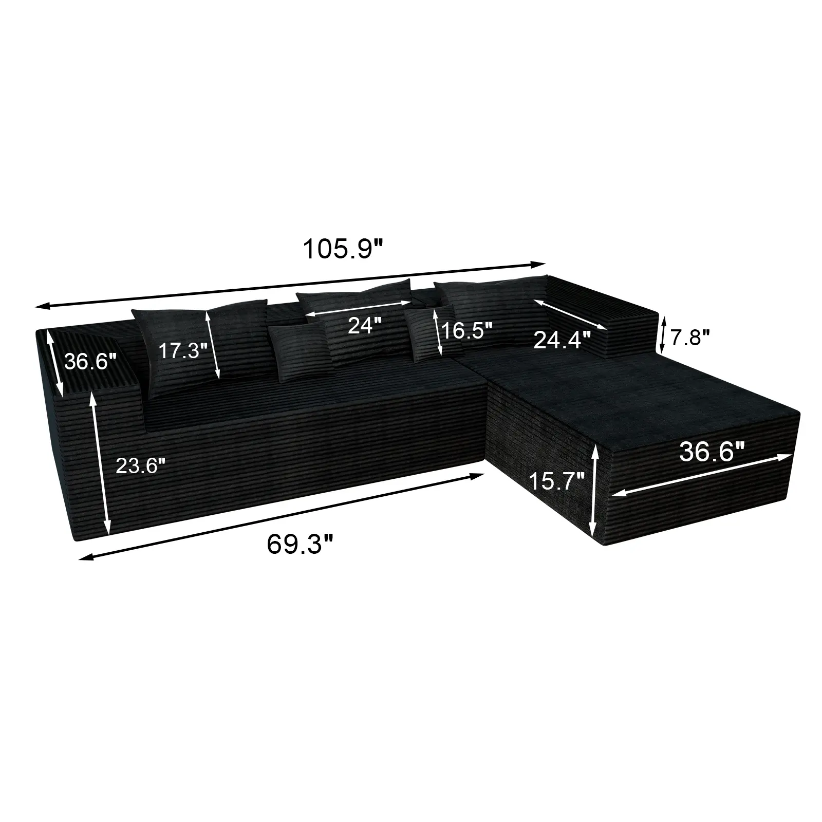 Modular Sectional Sofa: This spacious 105.9-inch modular sofa provides ample comfortable space for the whole family to enjoy stylish relaxation. Its flexible and versatile layout allows you to combine it however you like – from a stylish L-shaped chaise lounge sofa to a symmetrical living room sofa with armrests on both sides, it's easily achievable. It can serve as an everyday sofa bed or a temporary guest bed, easily adapting to your space and lifestyle.