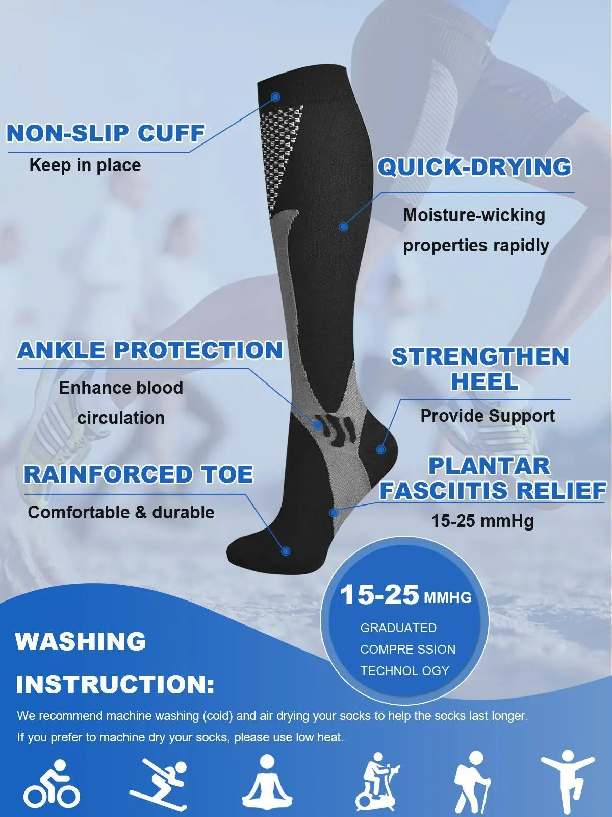 1. 20-30 mmHg compression socks to release. Once you put on these socks, which covers your lower leg and the whole feet, so that you could feel better