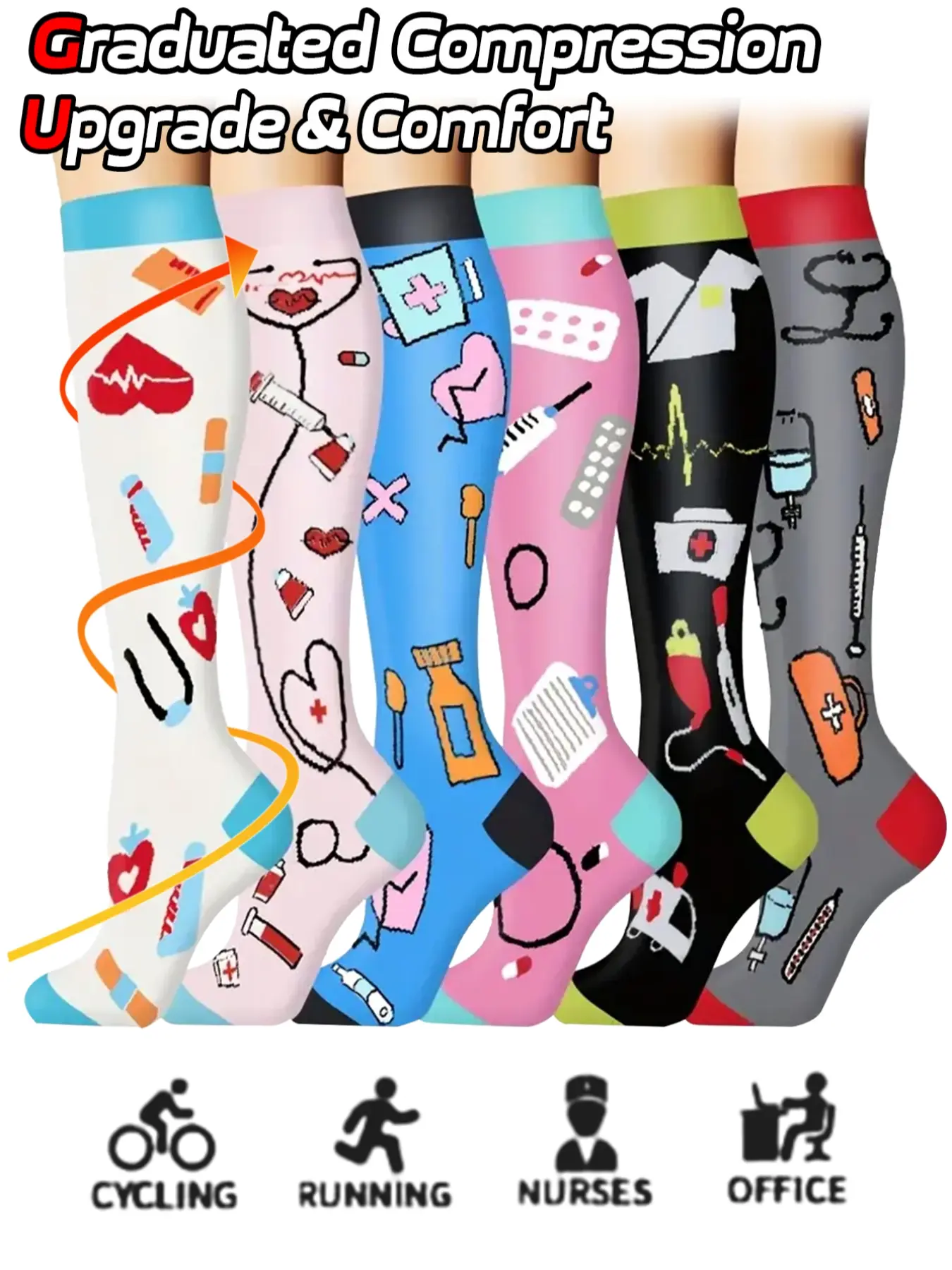 6 pairs of men's and women's compression socks wide calf booster socks, for circulation, running, nurses, pregnant women, various colour patterns available, gift for nurse doctor, Sports Athletic Socks