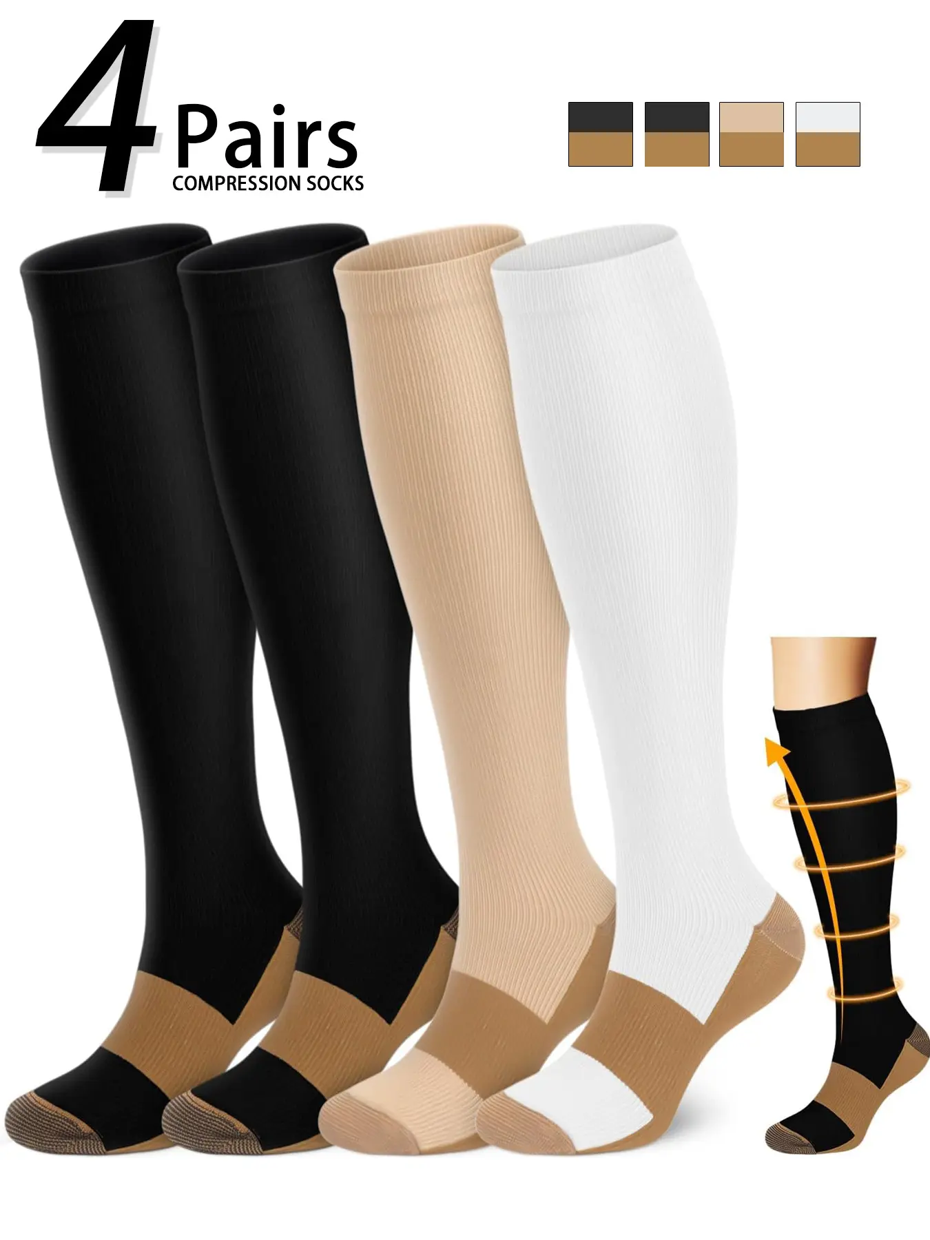 4 pairs of men's and women's compression socks 15-20 mmHg wide calf men's and women's booster socks for circulation, running, nurses, pregnant women Support for blood circulation, Athletic Running Socks